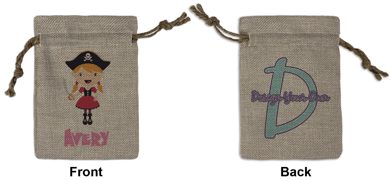 We sell our Burlap Gift Bags in 3 variant sized bags. Made with burlap polyester, each personalized bag can be secured with a twine drawstring pull. Your custom design is available to print on one side or both sides - completely up to you! The sizes of the bags measure approximately 4.5" x 6.5" for the smallest size, 6.5" x 8.0" for the medium size, and 6.5" x 13.5" for the large-sized bag.