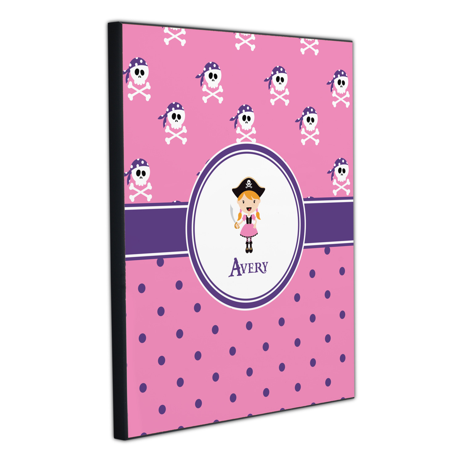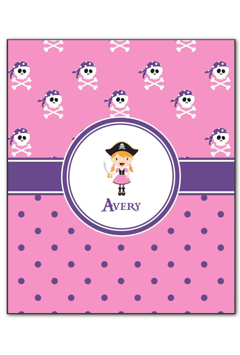 A wide band of purple, trimmed in white, highlight the little pirate girl in the white circle label that is trimmed in the coordinating purple color. Add your personalization in the label to complete the look.