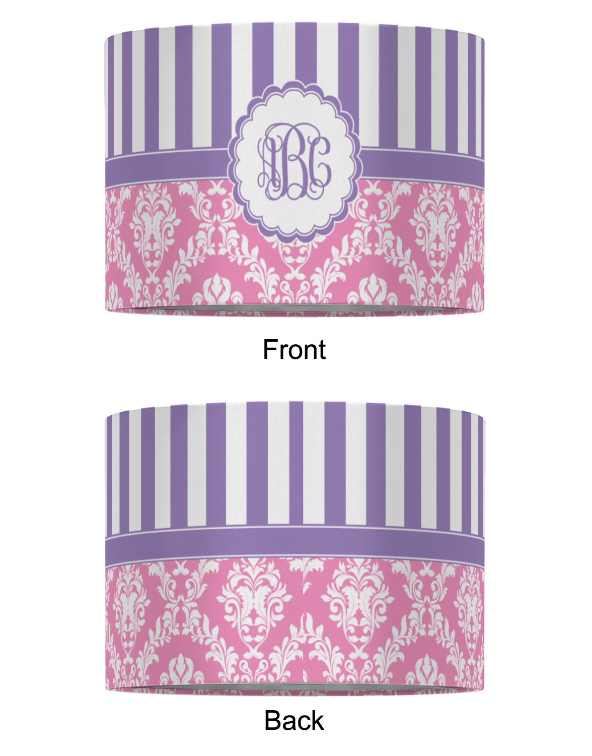 This stunning design is very feminine and elegant. It has simple, yet classic purple and white stripes on top with the stunningly elegant damask in pink and white on the bottom. The design is trimmed with a classic purple ribbon, along with a scalloped label and ever so beautiful interlocking monogram.