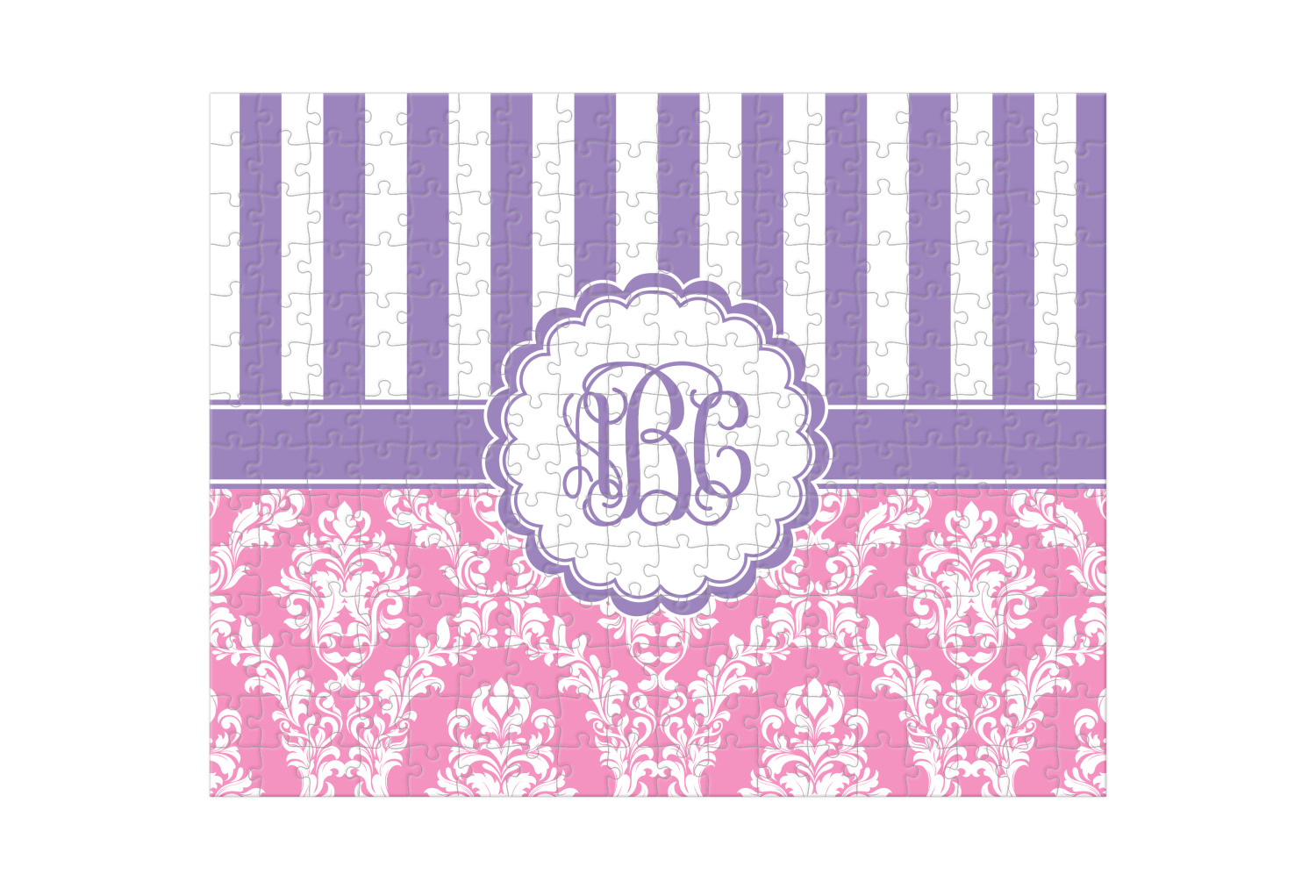This stunning design is very feminine and elegant. It has simple, yet classic purple and white stripes on top with the stunningly elegant damask in pink and white on the bottom. The design is trimmed with a classic purple ribbon, along with a scalloped label and ever so beautiful interlocking monogram.