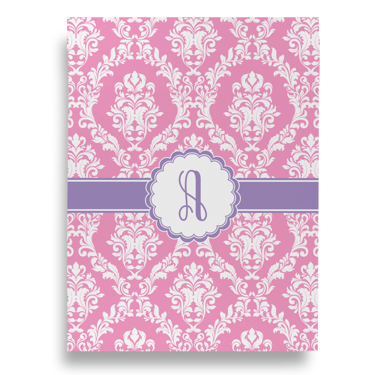 This stunning design is very feminine and elegant. It has simple, yet classic purple and white stripes on top with the stunningly elegant damask in pink and white on the bottom. The design is trimmed with a classic purple ribbon, along with a scalloped label and ever so beautiful interlocking monogram.