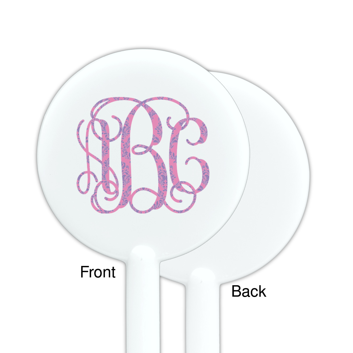 This stunning design is very feminine and elegant. It has simple, yet classic purple and white stripes on top with the stunningly elegant damask in pink and white on the bottom. The design is trimmed with a classic purple ribbon, along with a scalloped label and ever so beautiful interlocking monogram.