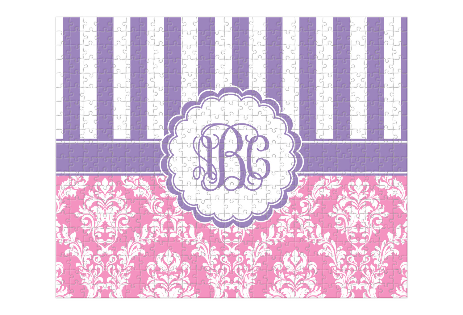 This stunning design is very feminine and elegant. It has simple, yet classic purple and white stripes on top with the stunningly elegant damask in pink and white on the bottom. The design is trimmed with a classic purple ribbon, along with a scalloped label and ever so beautiful interlocking monogram.