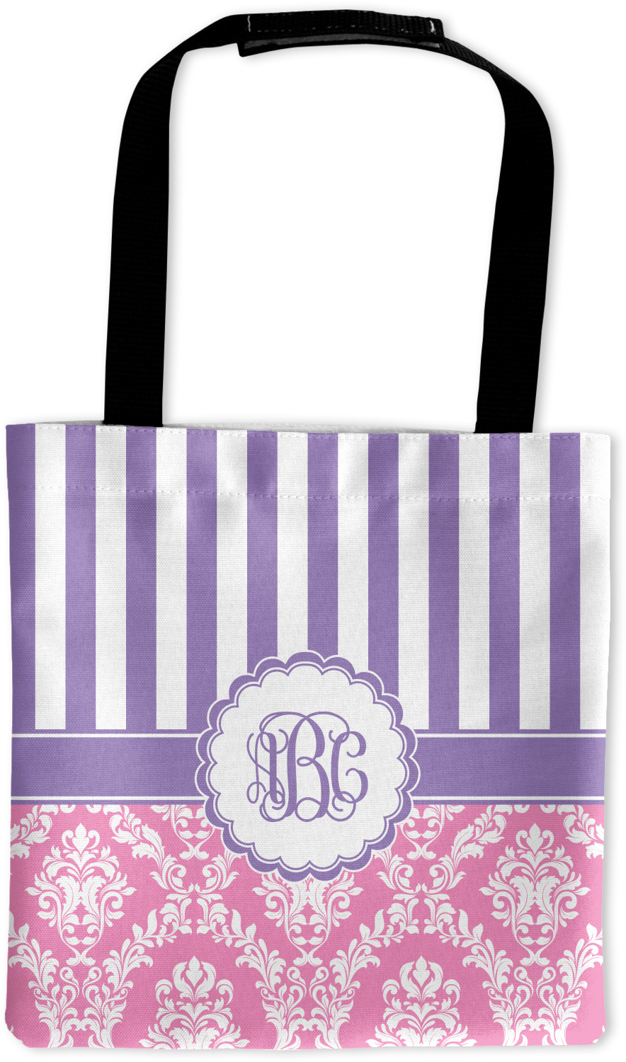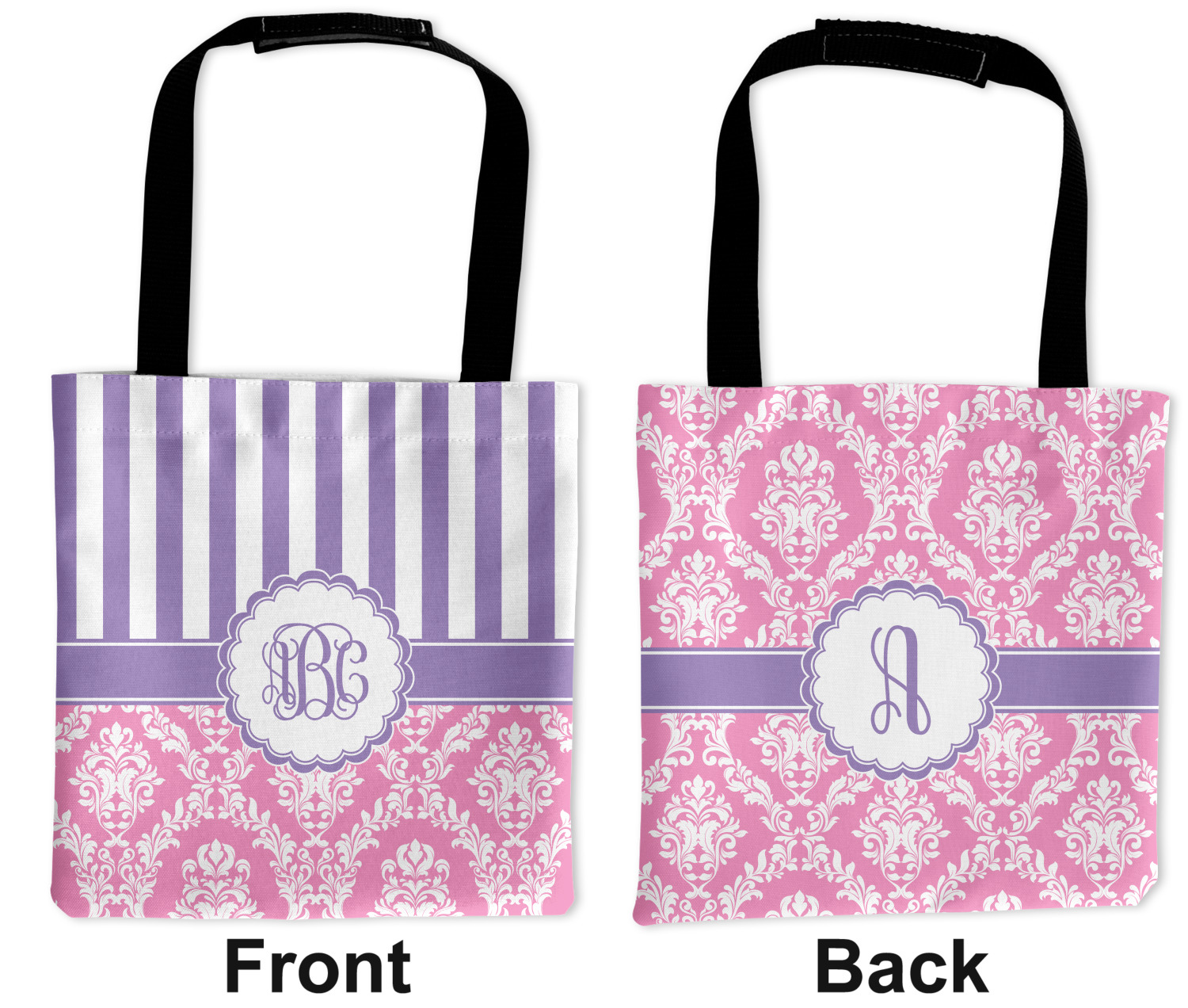 This stunning design is very feminine and elegant. It has simple, yet classic purple and white stripes on top with the stunningly elegant damask in pink and white on the bottom. The design is trimmed with a classic purple ribbon, along with a scalloped label and ever so beautiful interlocking monogram.