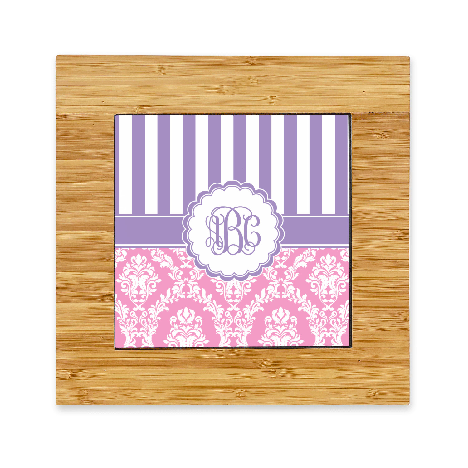 This stunning design is very feminine and elegant. It has simple, yet classic purple and white stripes on top with the stunningly elegant damask in pink and white on the bottom. The design is trimmed with a classic purple ribbon, along with a scalloped label and ever so beautiful interlocking monogram.