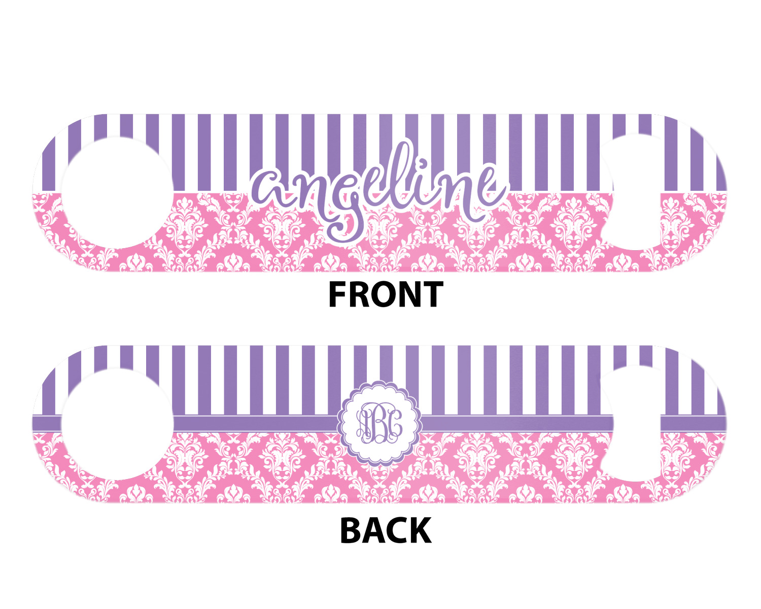 This stunning design is very feminine and elegant. It has simple, yet classic purple and white stripes on top with the stunningly elegant damask in pink and white on the bottom. The design is trimmed with a classic purple ribbon, along with a scalloped label and ever so beautiful interlocking monogram.