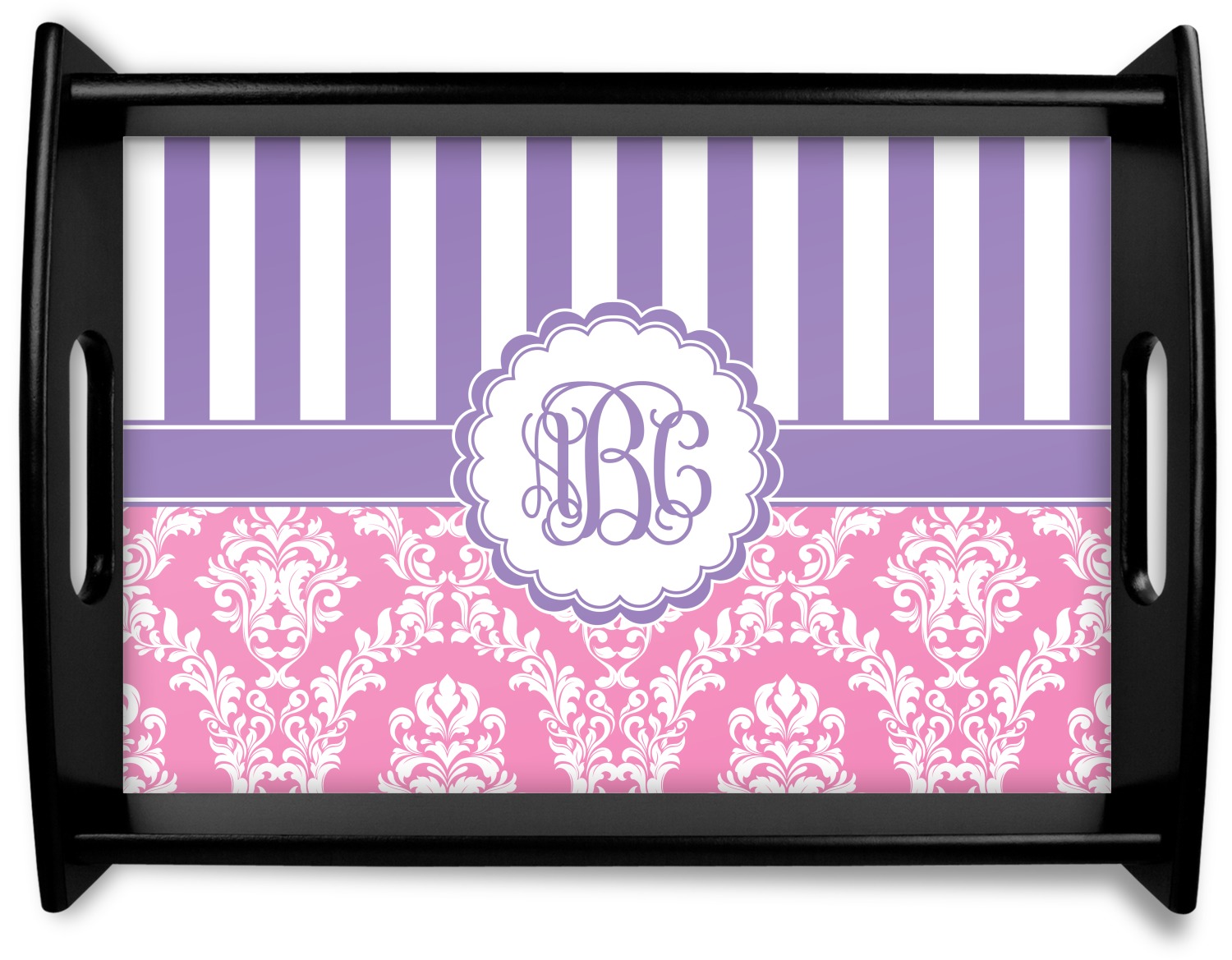 This stunning design is very feminine and elegant. It has simple, yet classic purple and white stripes on top with the stunningly elegant damask in pink and white on the bottom. The design is trimmed with a classic purple ribbon, along with a scalloped label and ever so beautiful interlocking monogram.