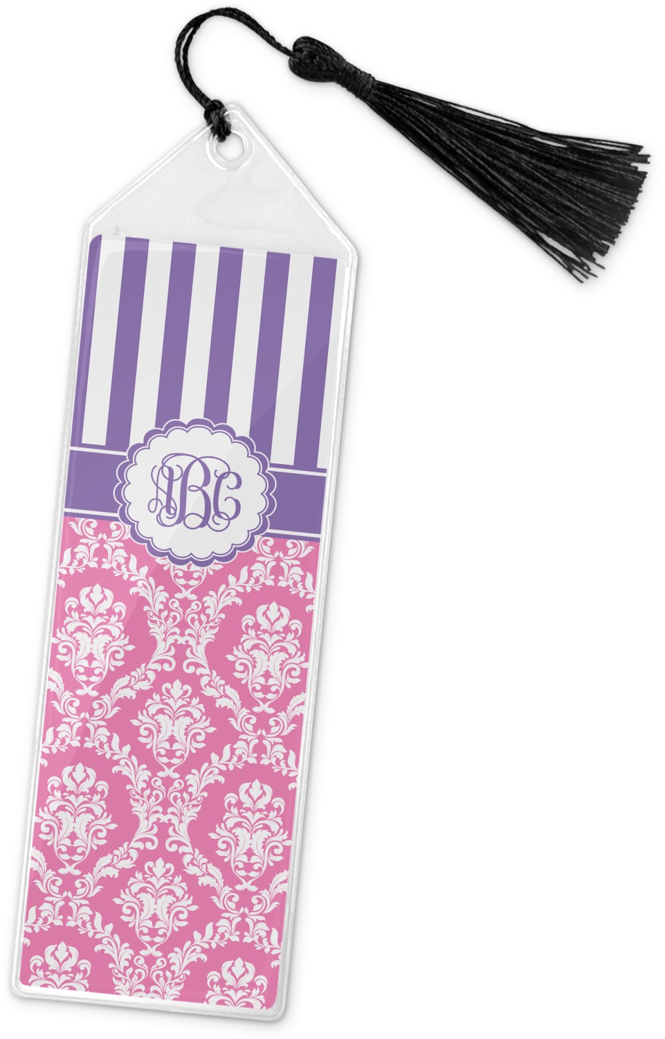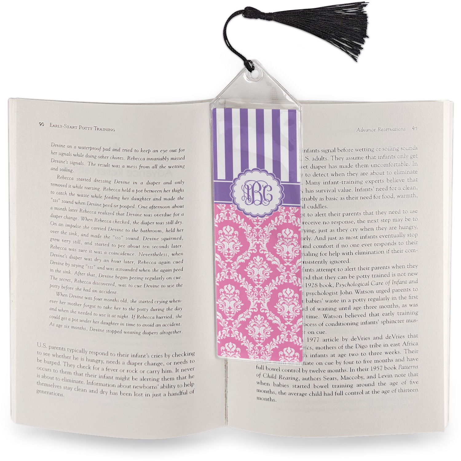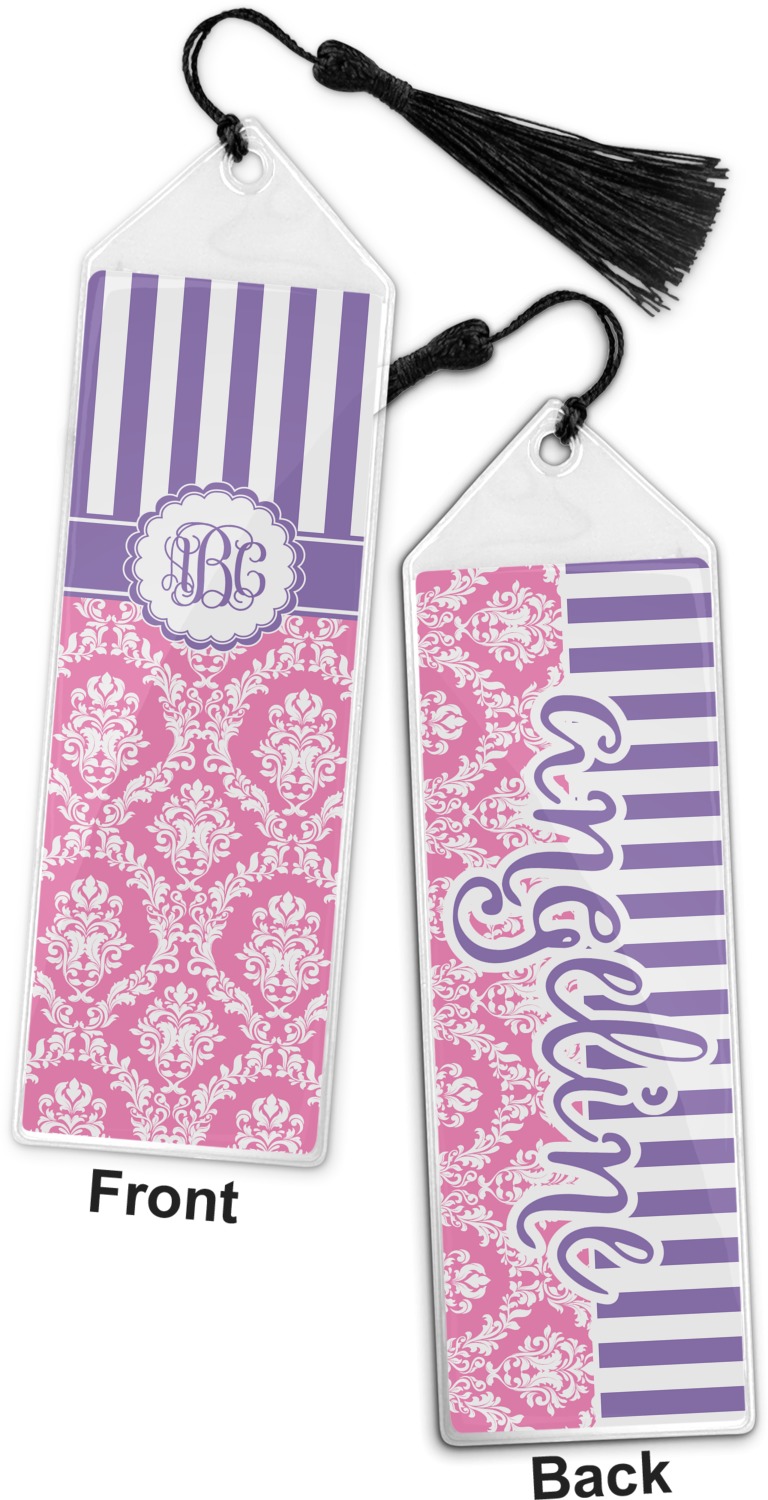 Your personalized bookmark is made of a sturdy, clear vinyl, and is approximately 7.5" x 2.25". We display your personalization on vinyl inserts that are placed on both sides. Accompanying each book marker is a black, fringe tassel that attaches to the reinforced, triangular header.