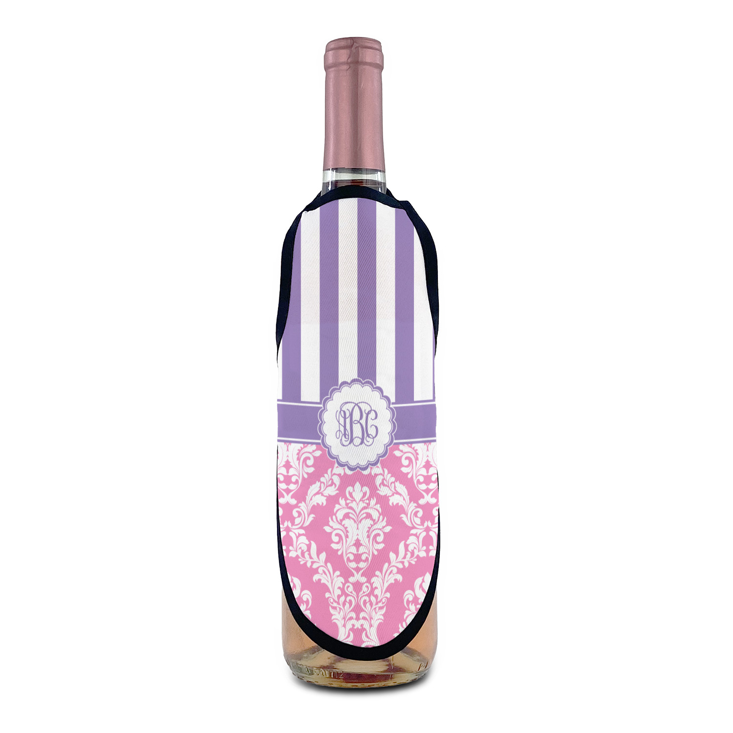 This stunning design is very feminine and elegant. It has simple, yet classic purple and white stripes on top with the stunningly elegant damask in pink and white on the bottom. The design is trimmed with a classic purple ribbon, along with a scalloped label and ever so beautiful interlocking monogram.
