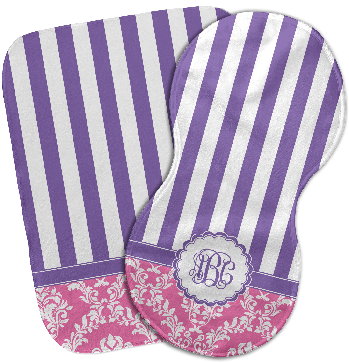 This stunning design is very feminine and elegant. It has simple, yet classic purple and white stripes on top with the stunningly elegant damask in pink and white on the bottom. The design is trimmed with a classic purple ribbon, along with a scalloped label and ever so beautiful interlocking monogram.