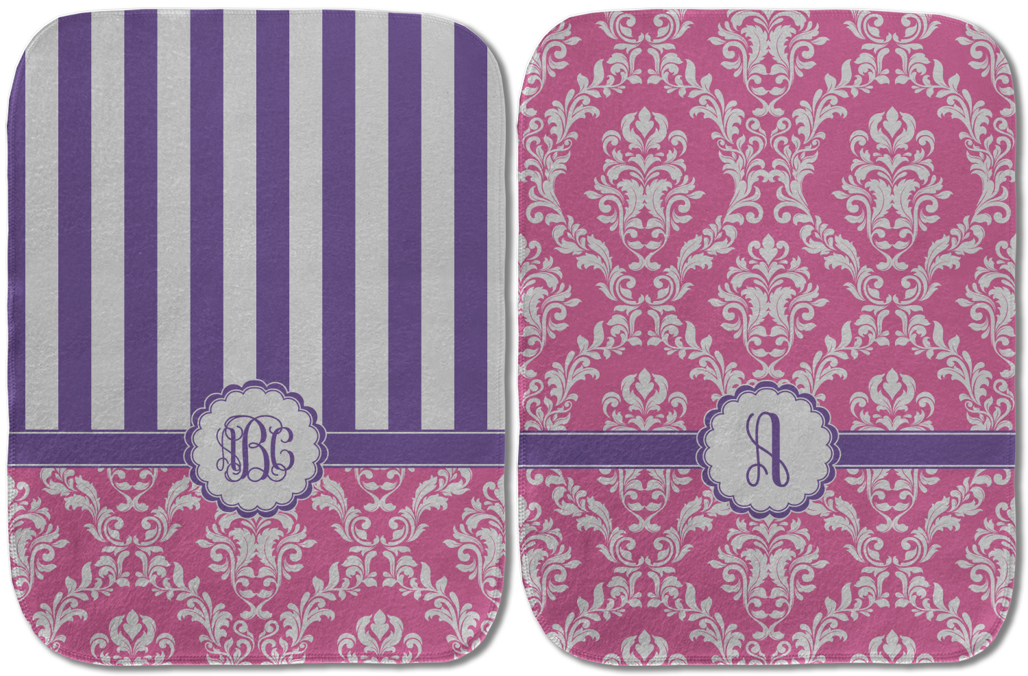 This stunning design is very feminine and elegant. It has simple, yet classic purple and white stripes on top with the stunningly elegant damask in pink and white on the bottom. The design is trimmed with a classic purple ribbon, along with a scalloped label and ever so beautiful interlocking monogram.