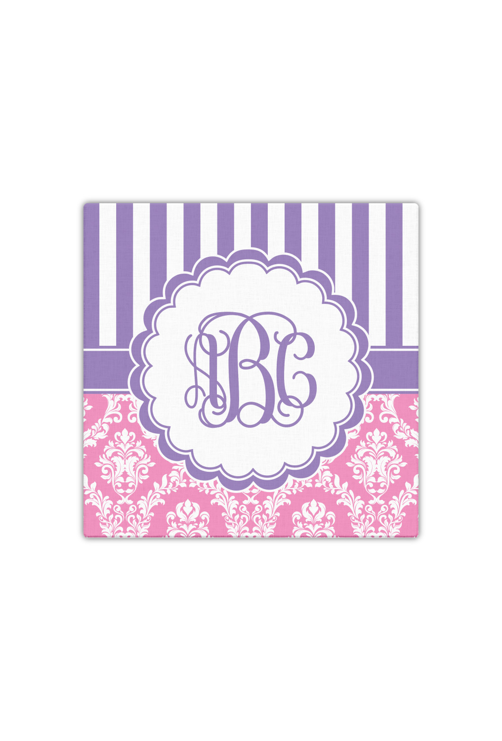 This stunning design is very feminine and elegant. It has simple, yet classic purple and white stripes on top with the stunningly elegant damask in pink and white on the bottom. The design is trimmed with a classic purple ribbon, along with a scalloped label and ever so beautiful interlocking monogram.