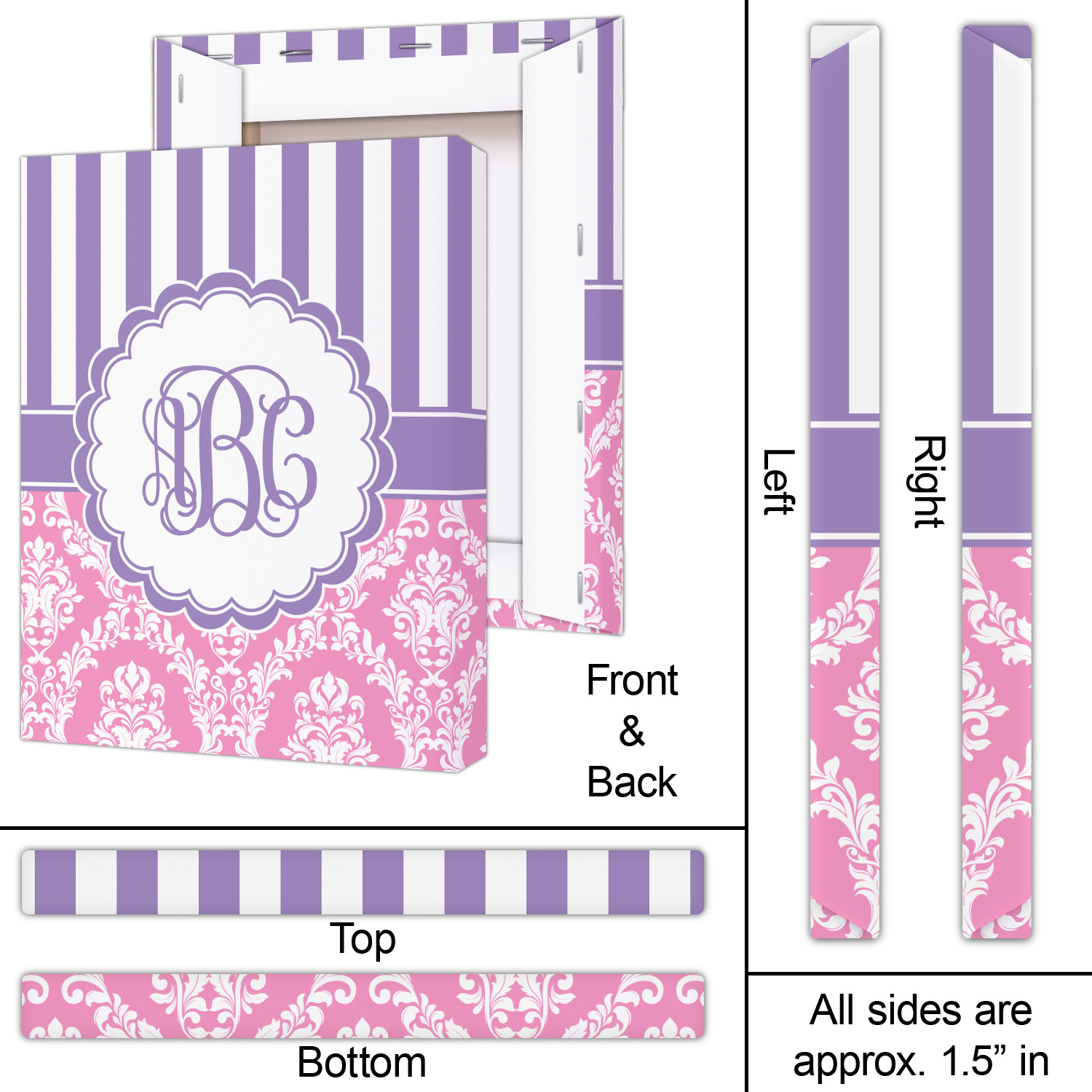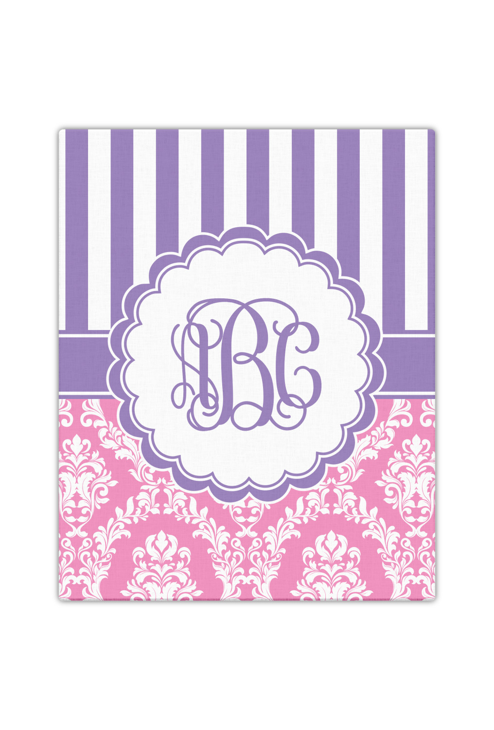 This stunning design is very feminine and elegant. It has simple, yet classic purple and white stripes on top with the stunningly elegant damask in pink and white on the bottom. The design is trimmed with a classic purple ribbon, along with a scalloped label and ever so beautiful interlocking monogram.