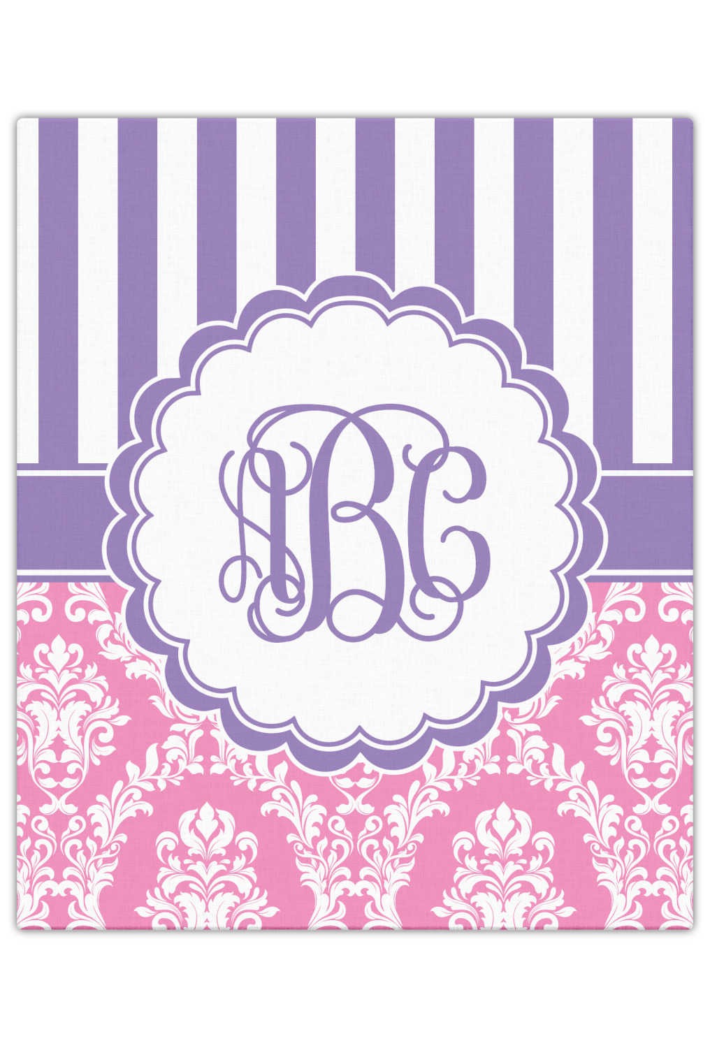 This stunning design is very feminine and elegant. It has simple, yet classic purple and white stripes on top with the stunningly elegant damask in pink and white on the bottom. The design is trimmed with a classic purple ribbon, along with a scalloped label and ever so beautiful interlocking monogram.
