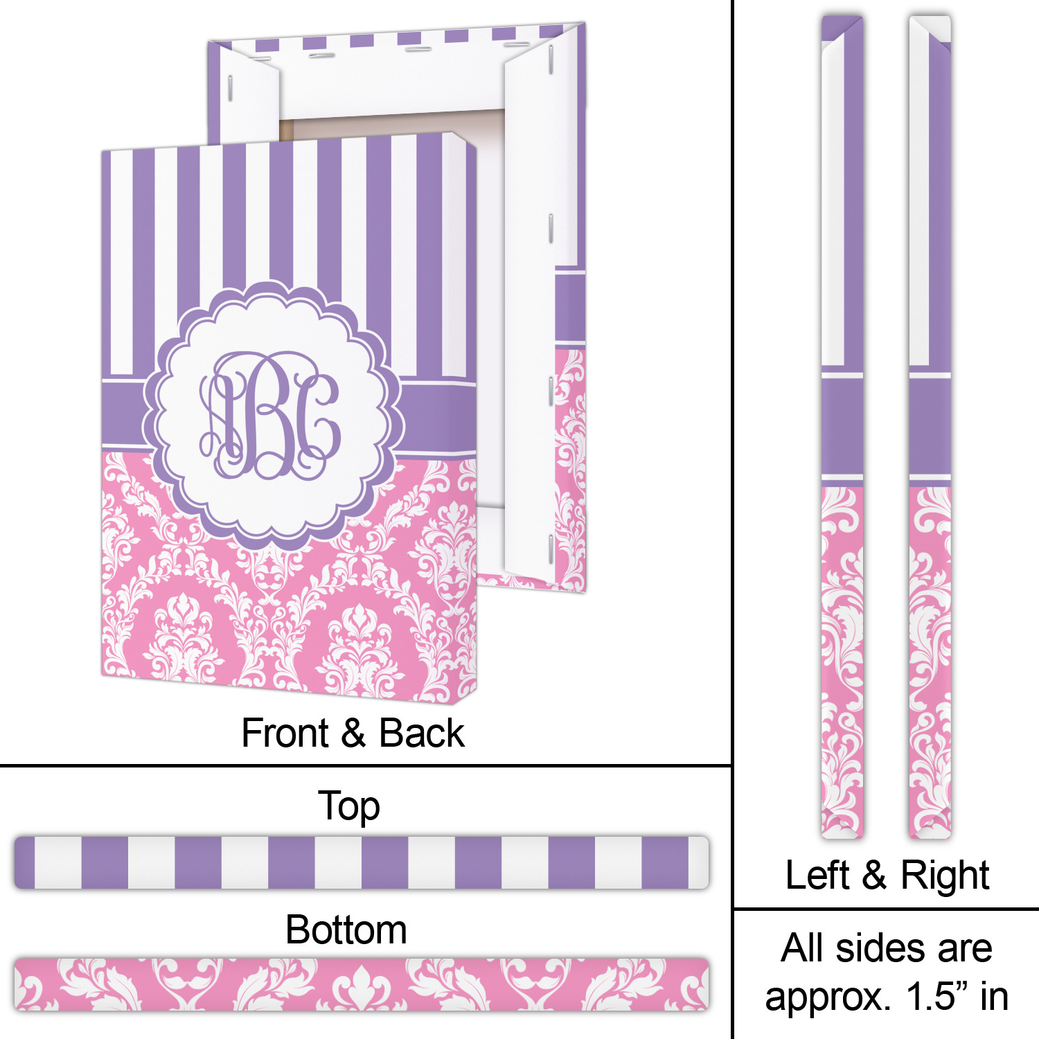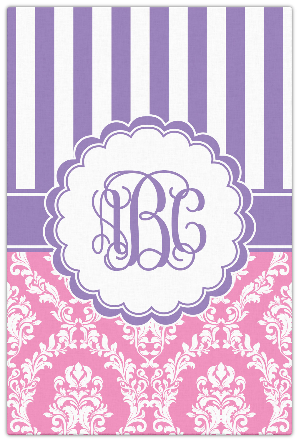 This stunning design is very feminine and elegant. It has simple, yet classic purple and white stripes on top with the stunningly elegant damask in pink and white on the bottom. The design is trimmed with a classic purple ribbon, along with a scalloped label and ever so beautiful interlocking monogram.
