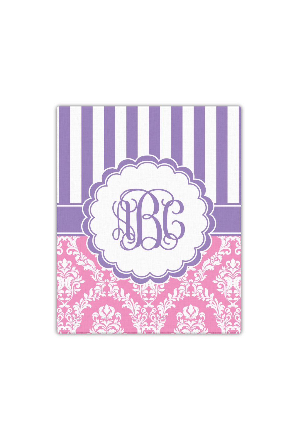 This stunning design is very feminine and elegant. It has simple, yet classic purple and white stripes on top with the stunningly elegant damask in pink and white on the bottom. The design is trimmed with a classic purple ribbon, along with a scalloped label and ever so beautiful interlocking monogram.