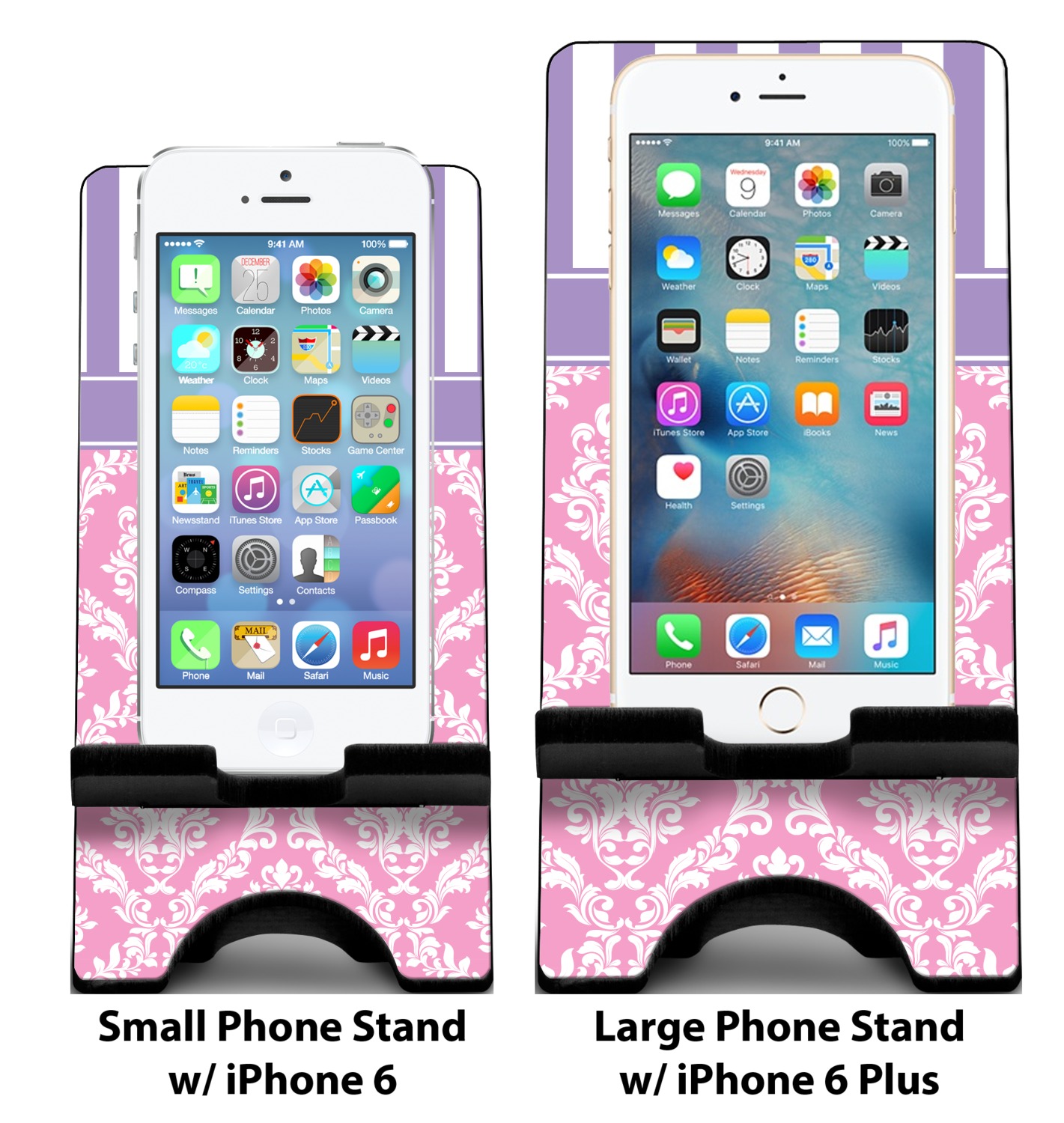 To meet your needs, we offer four variations of this IPhone stand. The backboard of the first version is shaped as a plain, yet sleek rectangle, and is available in two sizes. Our smaller size is approximately 4 by 3.25 by 7 inches, while the larger model is 4 by 3.77 by 8.5 inches. Alongside this model, we also provide you with a more decorative option. The upper part of our second version features a curved edge, for a classy, suave appearance. This phone holder is also sold in two sizes: a smaller version, which is 4 by 3.25 by 7 inches, and our larger model, which is 4 by 3.77 by 8.5 inches. Both models will support large phones, but the larger model is better if you wish to proudly display your personalized design.