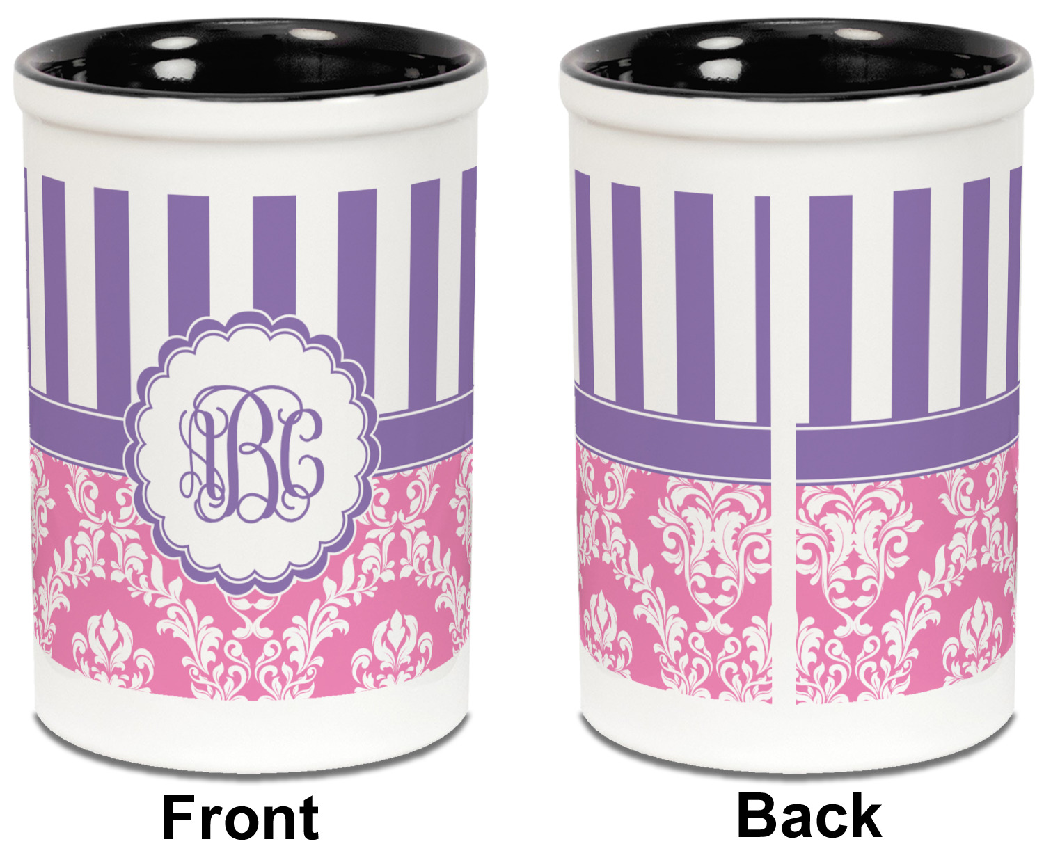 Both the blue and black pencil holders are a ceramic material, giving you a sturdy and long-lasting pen and pencil holder. We print your designs on the exterior of the pencil cup, covering most of the outside surface. There is a small white border on the top and bottom of the exterior of the pen holder, setting apart your design from the interior's color. Our ceramic pen caddy is roughly 3.5" x 3.5" x 5" in dimensions.