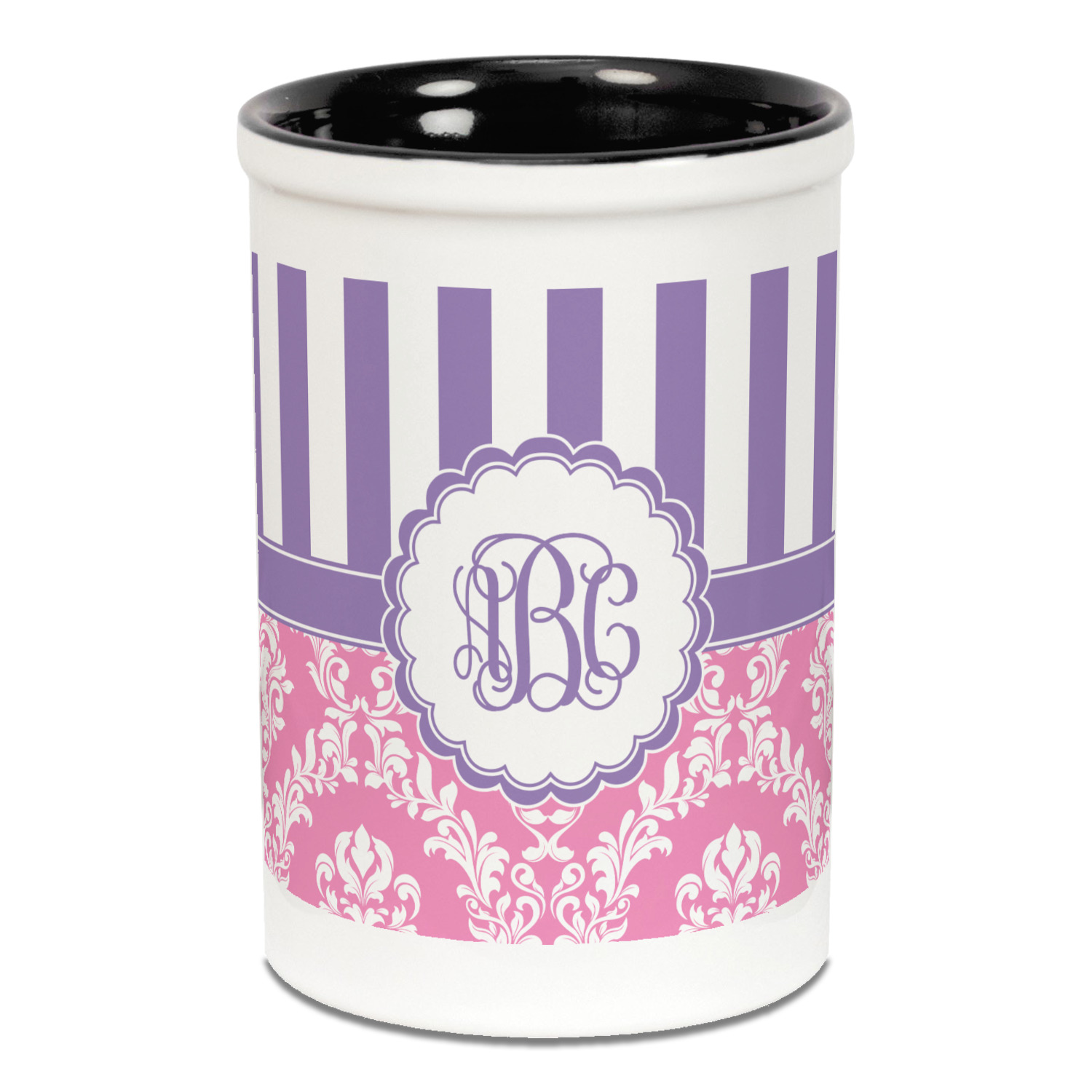 This stunning design is very feminine and elegant. It has simple, yet classic purple and white stripes on top with the stunningly elegant damask in pink and white on the bottom. The design is trimmed with a classic purple ribbon, along with a scalloped label and ever so beautiful interlocking monogram.