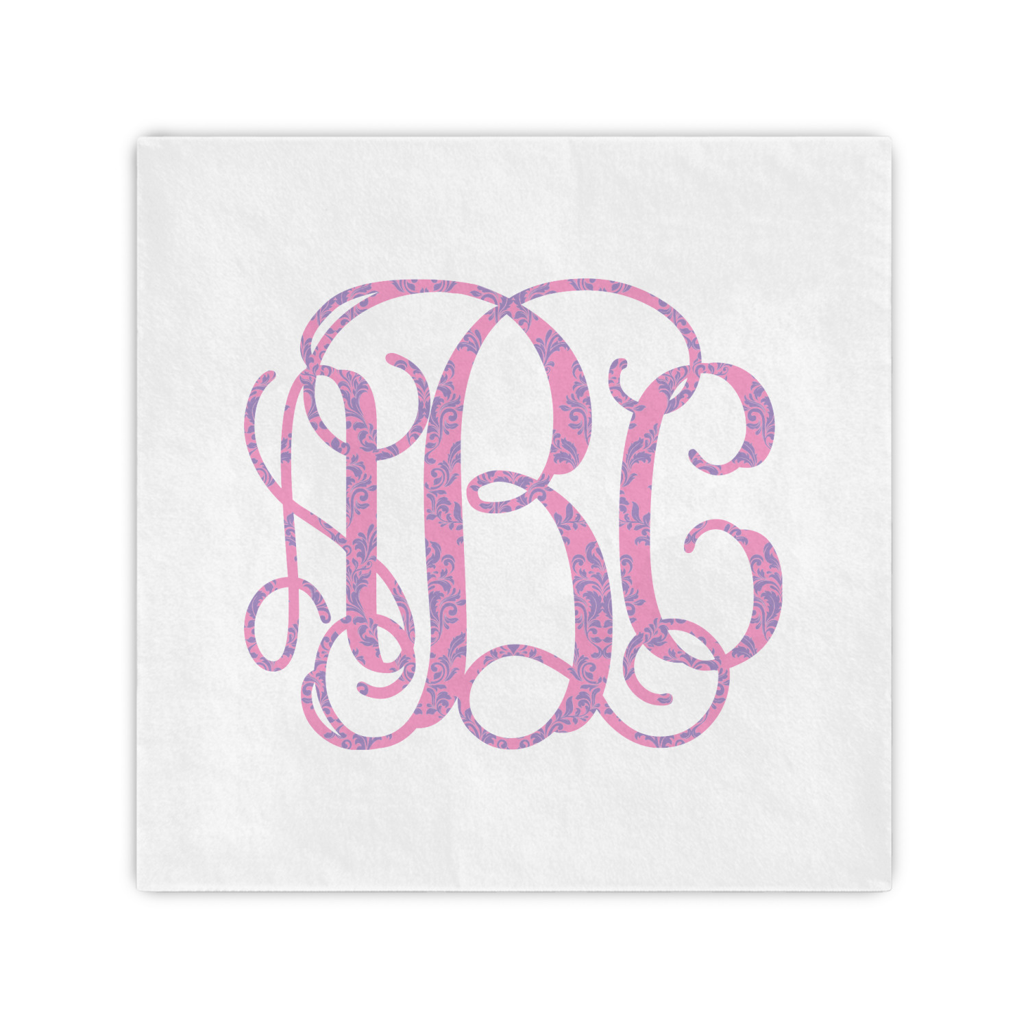 This stunning design is very feminine and elegant. It has simple, yet classic purple and white stripes on top with the stunningly elegant damask in pink and white on the bottom. The design is trimmed with a classic purple ribbon, along with a scalloped label and ever so beautiful interlocking monogram.