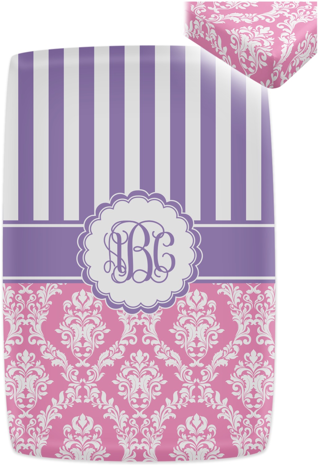 This stunning design is very feminine and elegant. It has simple, yet classic purple and white stripes on top with the stunningly elegant damask in pink and white on the bottom. The design is trimmed with a classic purple ribbon, along with a scalloped label and ever so beautiful interlocking monogram.