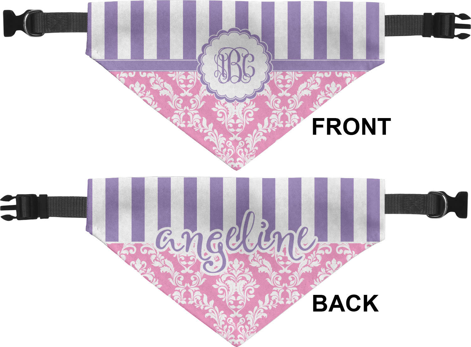 We print the front and back of these dog bandanas with your customized design. The bandana itself is made from a durable polyester, sewn together with a gap large enough to accommodate any collar. Regardless, the bandana includes a plain black, canvas collar with plastic snaps, that can easily be removed if desired. These dog bandana collars are available in four sizes: small, medium, large, and extra large. Please see our sizing chart for more information regarding the dimensions of each size.