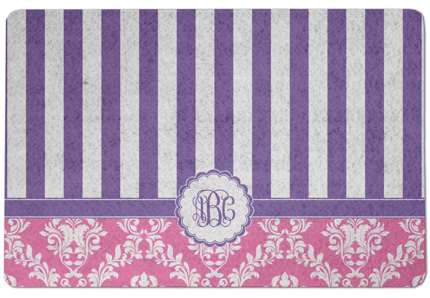 This stunning design is very feminine and elegant. It has simple, yet classic purple and white stripes on top with the stunningly elegant damask in pink and white on the bottom. The design is trimmed with a classic purple ribbon, along with a scalloped label and ever so beautiful interlocking monogram.