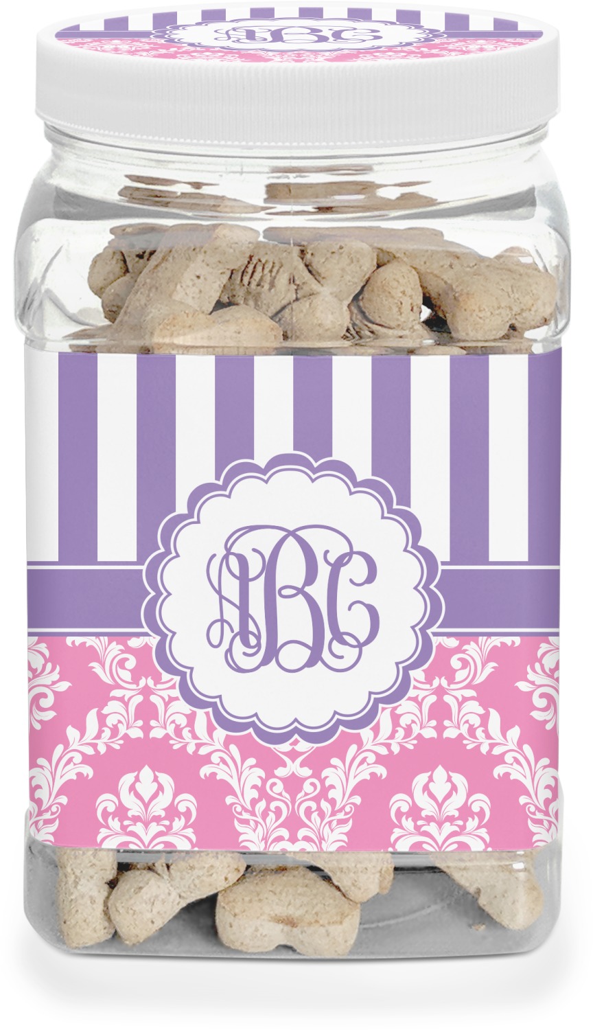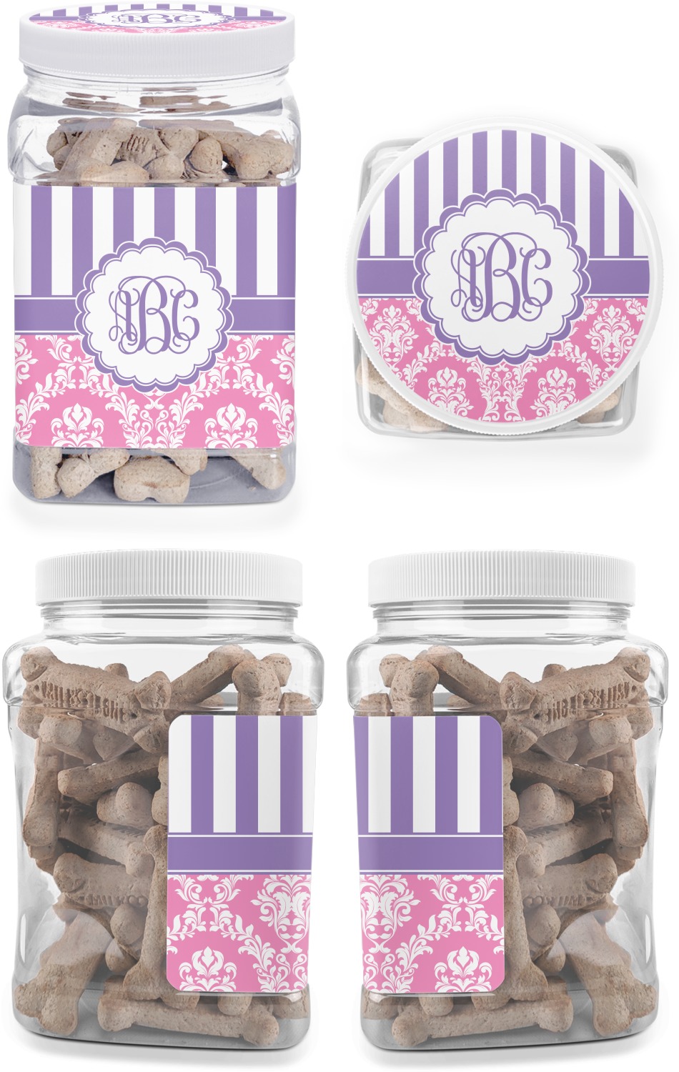 This half gallon jar, made from a sturdy plastic, is the perfect way to keep treats from any naughty pet paws, while still keeping them ready on hand for when your pup performs an impressive trick. This dog cookie jar features a screw-on, white lid that displays your personalized design on a vinyl sticker. We apply another customized sticker that wraps around the front and sides of the jar. Our dog treat jar also has indentations on the rear ends of the sides, which allows for convenient handling, and its square frame allows for easy storage.