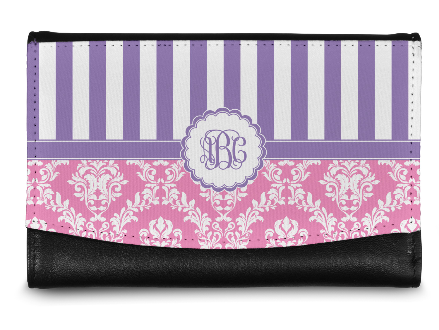 This stunning design is very feminine and elegant. It has simple, yet classic purple and white stripes on top with the stunningly elegant damask in pink and white on the bottom. The design is trimmed with a classic purple ribbon, along with a scalloped label and ever so beautiful interlocking monogram.