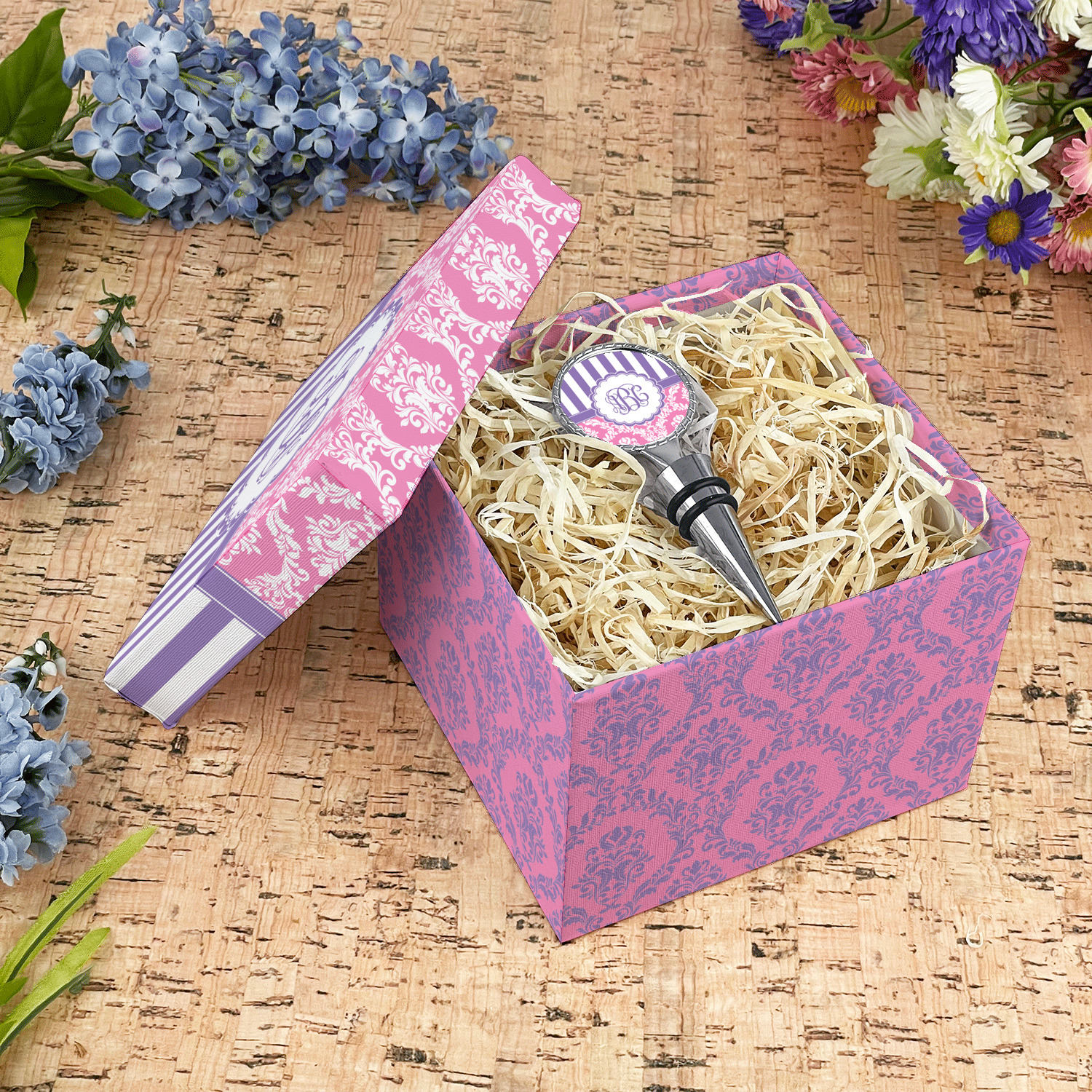 This stunning design is very feminine and elegant. It has simple, yet classic purple and white stripes on top with the stunningly elegant damask in pink and white on the bottom. The design is trimmed with a classic purple ribbon, along with a scalloped label and ever so beautiful interlocking monogram.
