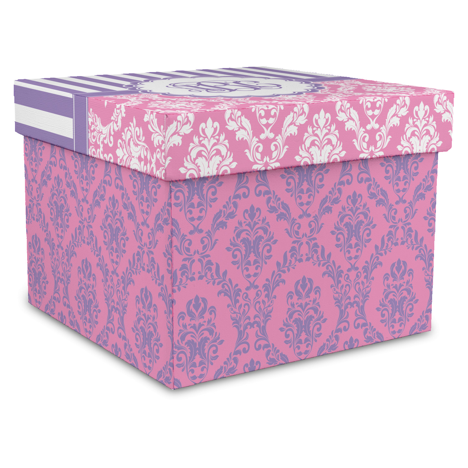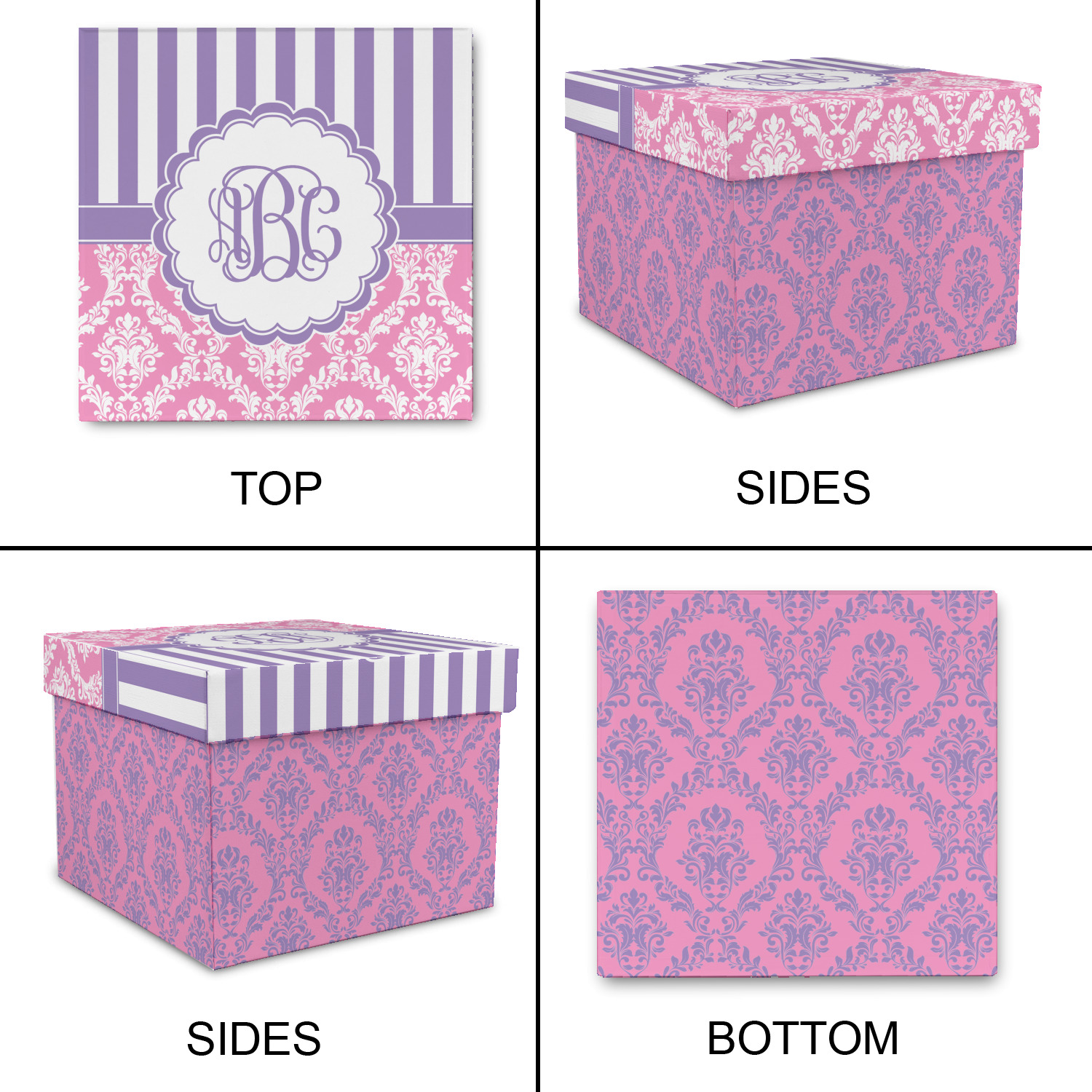 This stunning design is very feminine and elegant. It has simple, yet classic purple and white stripes on top with the stunningly elegant damask in pink and white on the bottom. The design is trimmed with a classic purple ribbon, along with a scalloped label and ever so beautiful interlocking monogram.