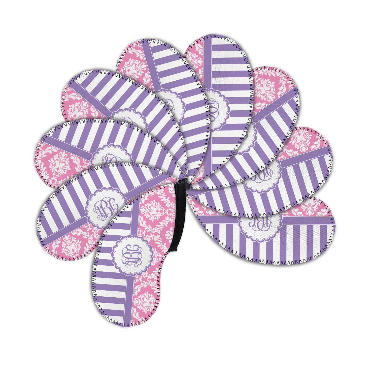 This stunning design is very feminine and elegant. It has simple, yet classic purple and white stripes on top with the stunningly elegant damask in pink and white on the bottom. The design is trimmed with a classic purple ribbon, along with a scalloped label and ever so beautiful interlocking monogram.