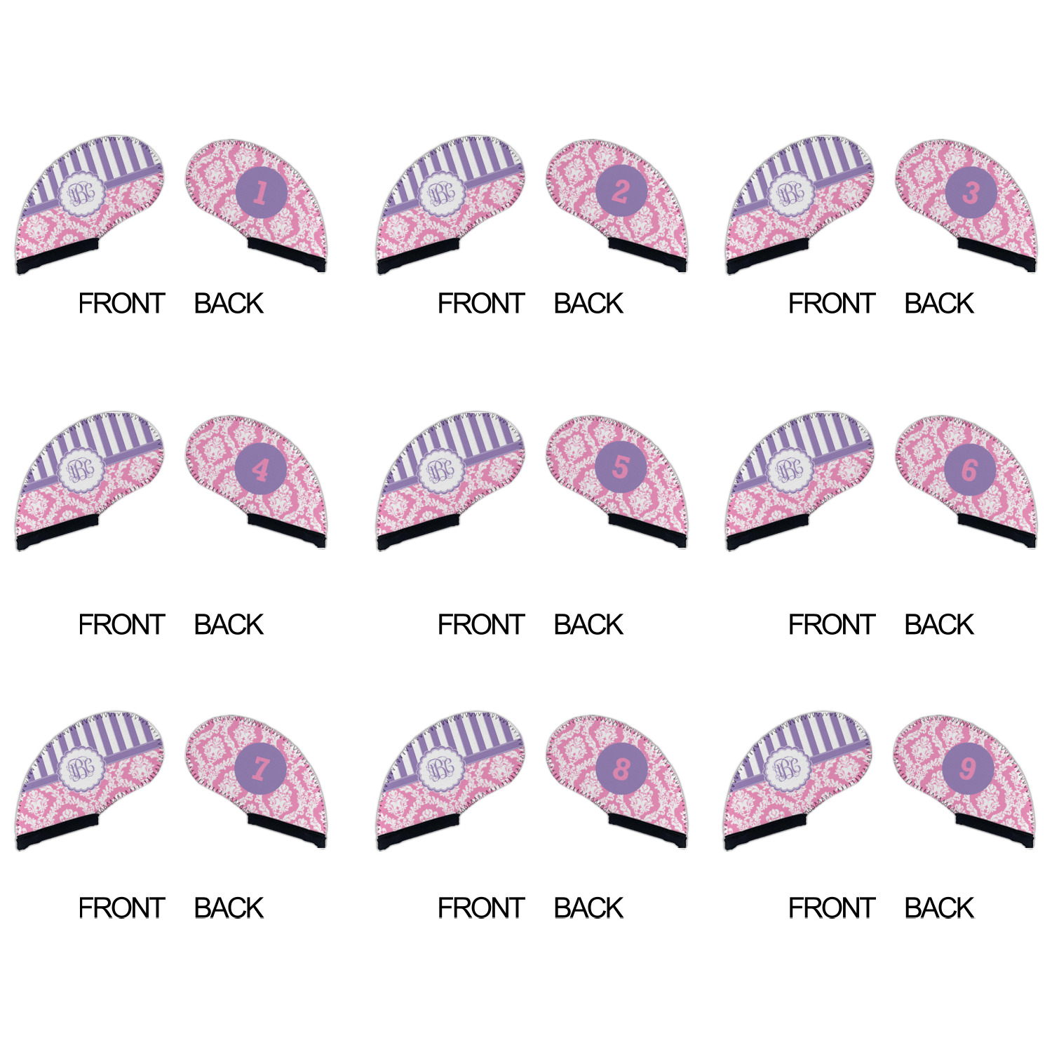 This stunning design is very feminine and elegant. It has simple, yet classic purple and white stripes on top with the stunningly elegant damask in pink and white on the bottom. The design is trimmed with a classic purple ribbon, along with a scalloped label and ever so beautiful interlocking monogram.