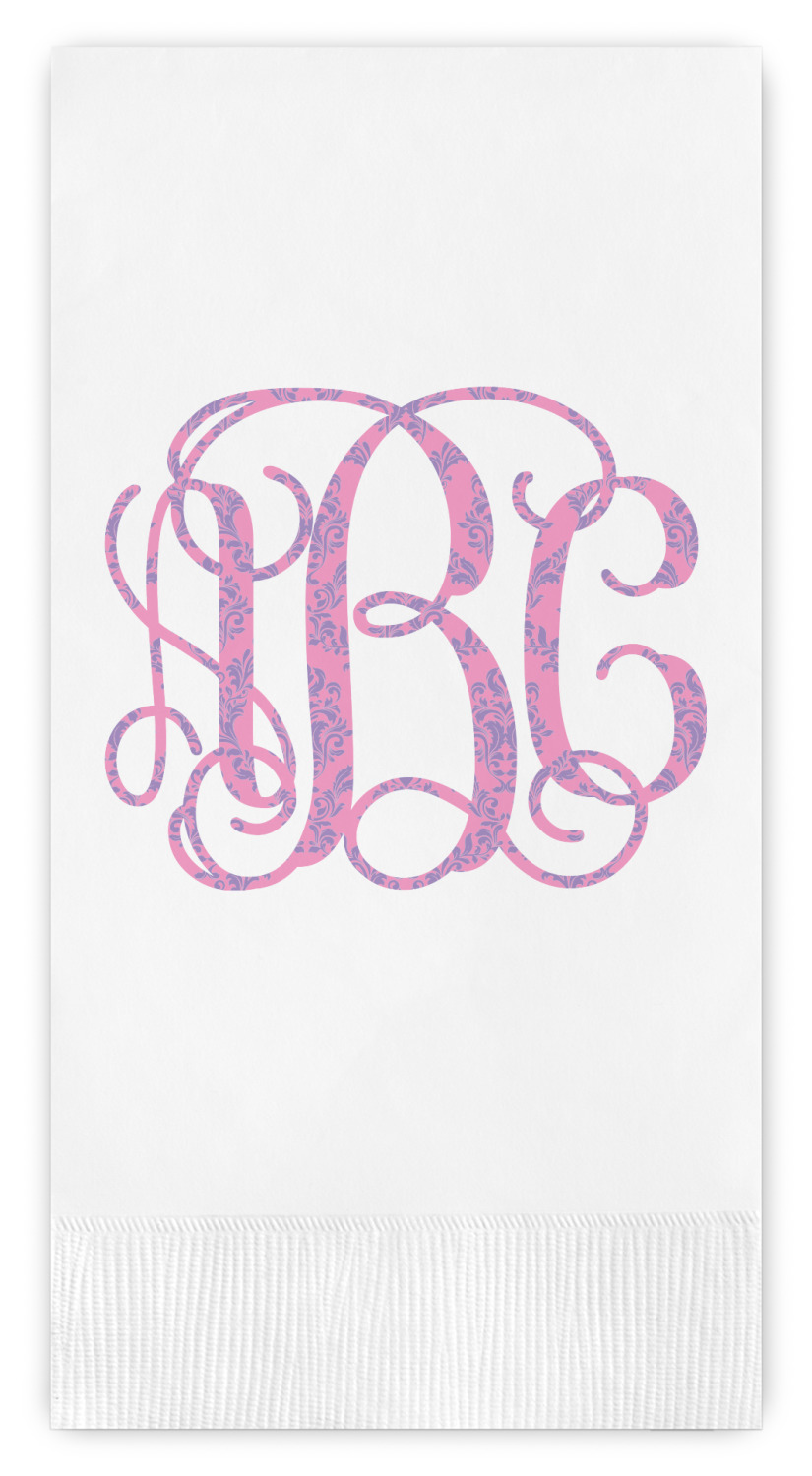 This stunning design is very feminine and elegant. It has simple, yet classic purple and white stripes on top with the stunningly elegant damask in pink and white on the bottom. The design is trimmed with a classic purple ribbon, along with a scalloped label and ever so beautiful interlocking monogram.