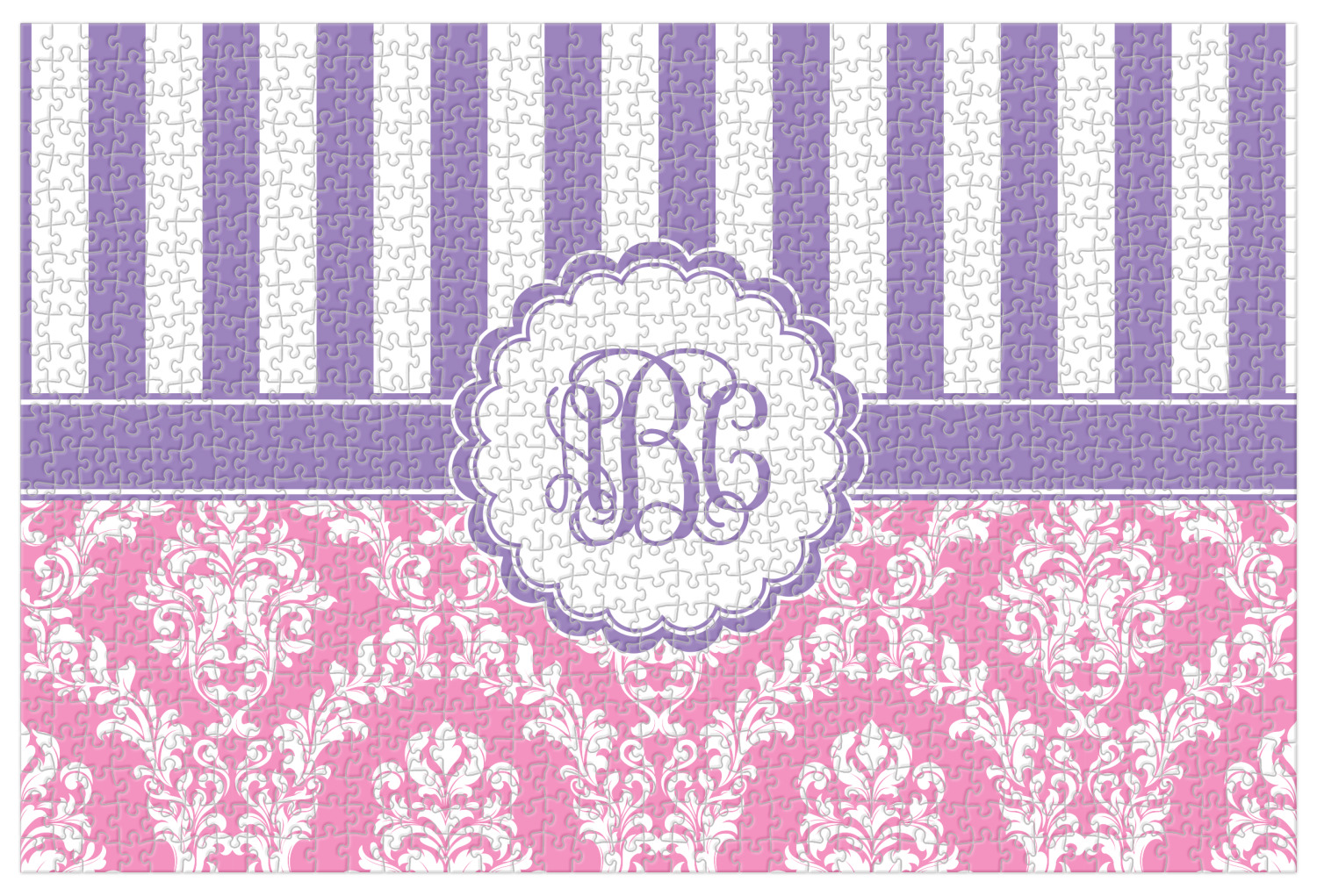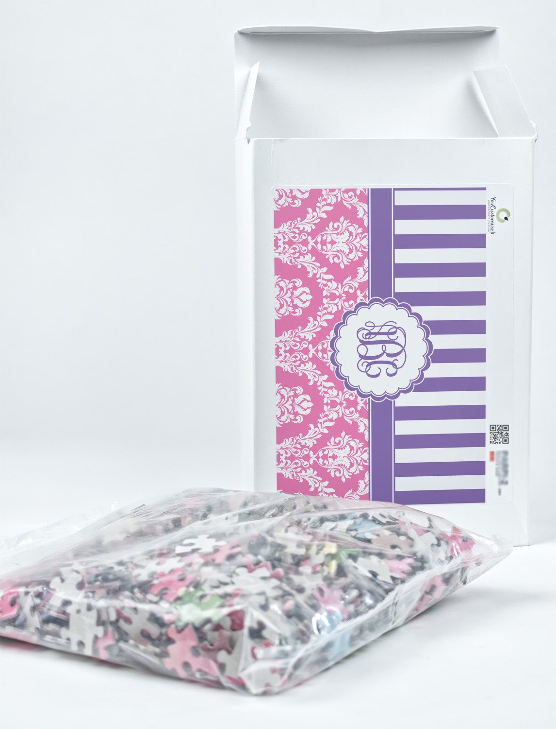 This stunning design is very feminine and elegant. It has simple, yet classic purple and white stripes on top with the stunningly elegant damask in pink and white on the bottom. The design is trimmed with a classic purple ribbon, along with a scalloped label and ever so beautiful interlocking monogram.