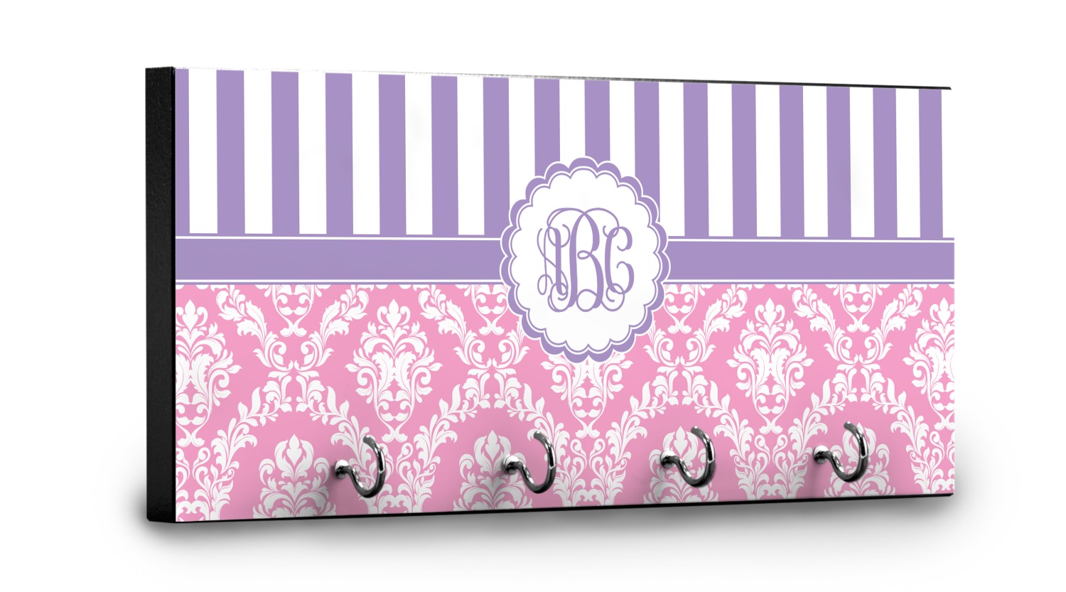 This 11" x 5" key hanger is made of sturdy wood and has four metal hooks lining the bottom. This is the perfect size for a family with several drivers. Not only can you hang keys on it though, but pet leashes and other small items. The board is black on the sides and back and is printed with the design of your choice on the front.