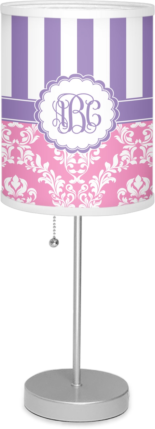 This stunning design is very feminine and elegant. It has simple, yet classic purple and white stripes on top with the stunningly elegant damask in pink and white on the bottom. The design is trimmed with a classic purple ribbon, along with a scalloped label and ever so beautiful interlocking monogram.