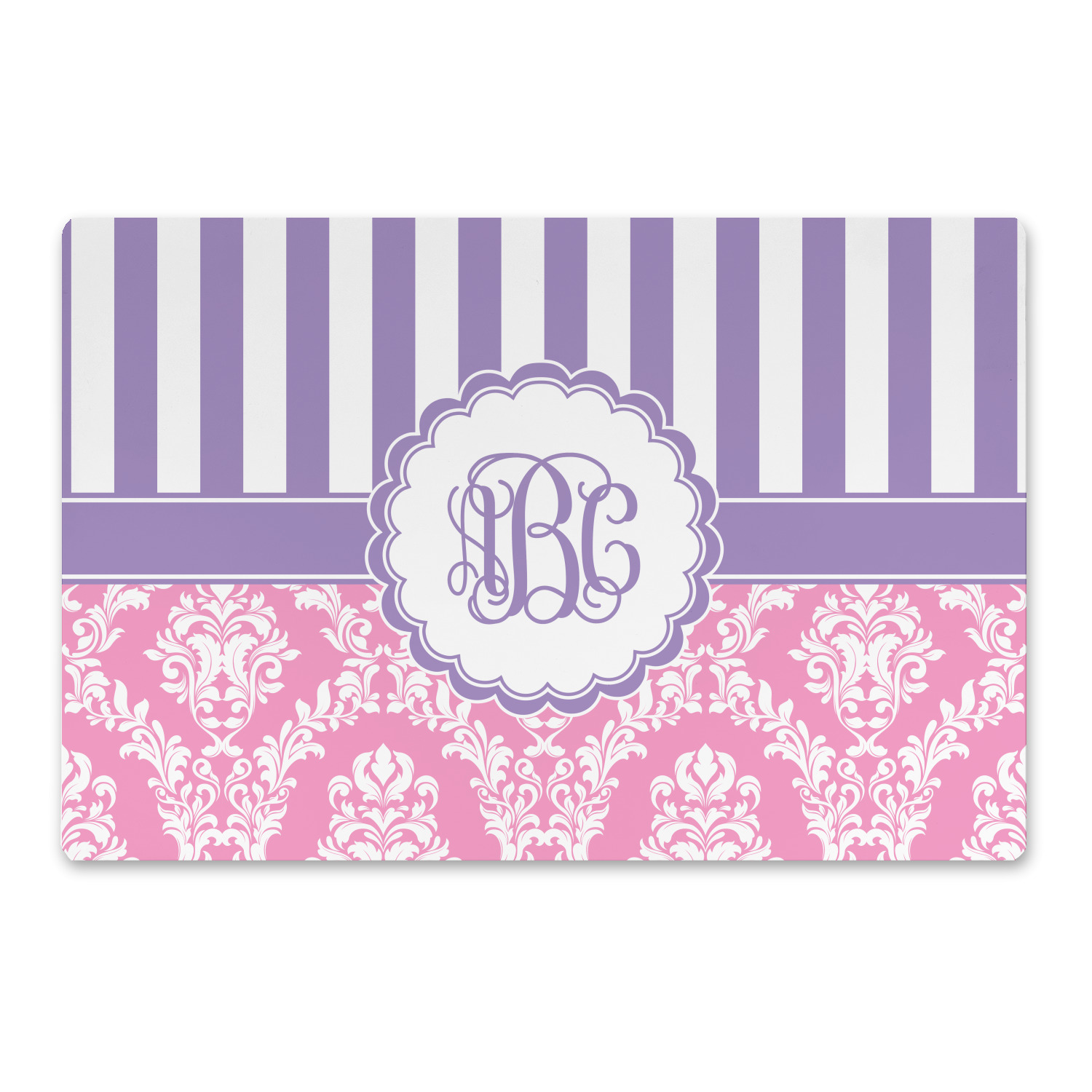 This stunning design is very feminine and elegant. It has simple, yet classic purple and white stripes on top with the stunningly elegant damask in pink and white on the bottom. The design is trimmed with a classic purple ribbon, along with a scalloped label and ever so beautiful interlocking monogram.