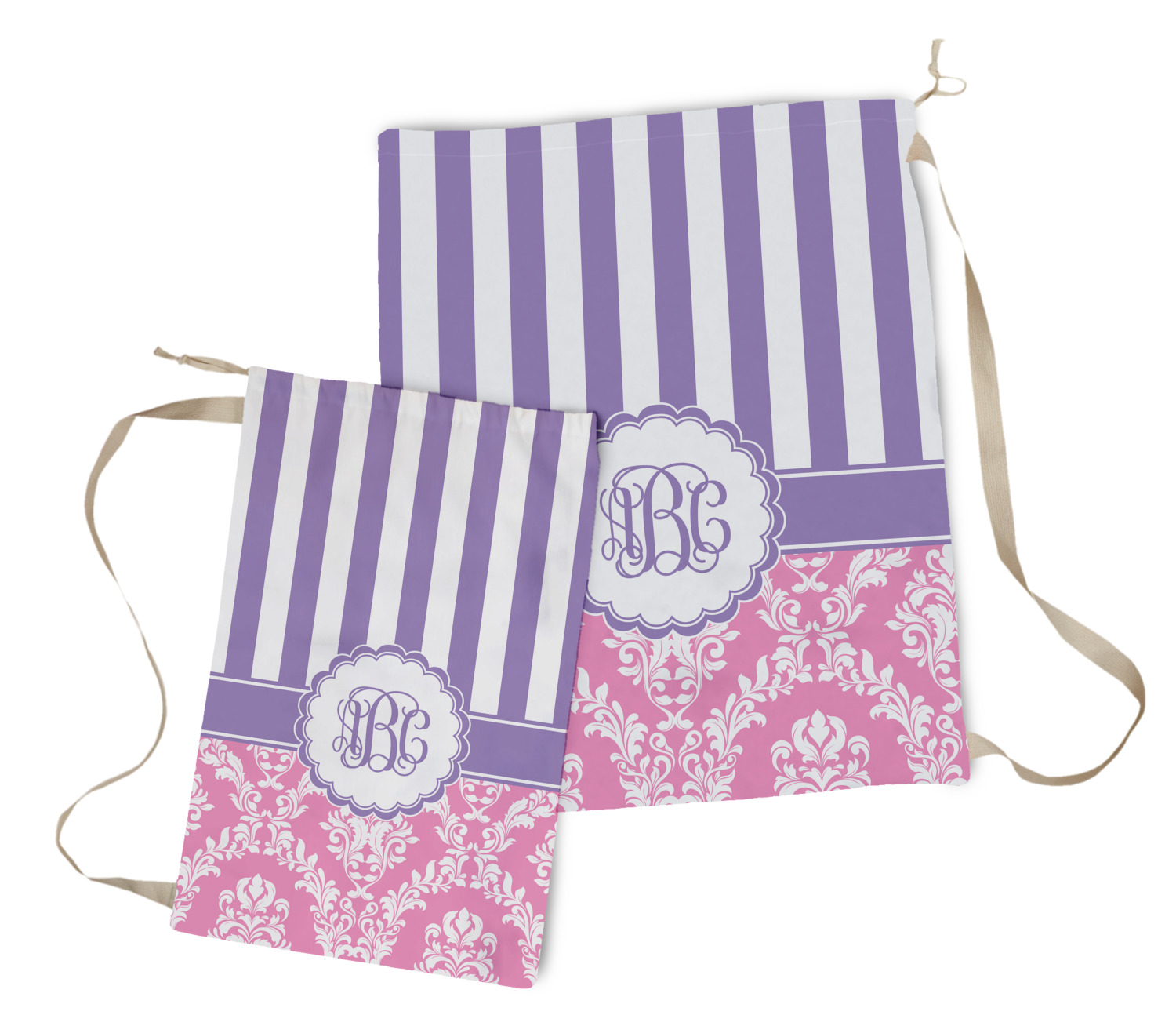 This stunning design is very feminine and elegant. It has simple, yet classic purple and white stripes on top with the stunningly elegant damask in pink and white on the bottom. The design is trimmed with a classic purple ribbon, along with a scalloped label and ever so beautiful interlocking monogram.