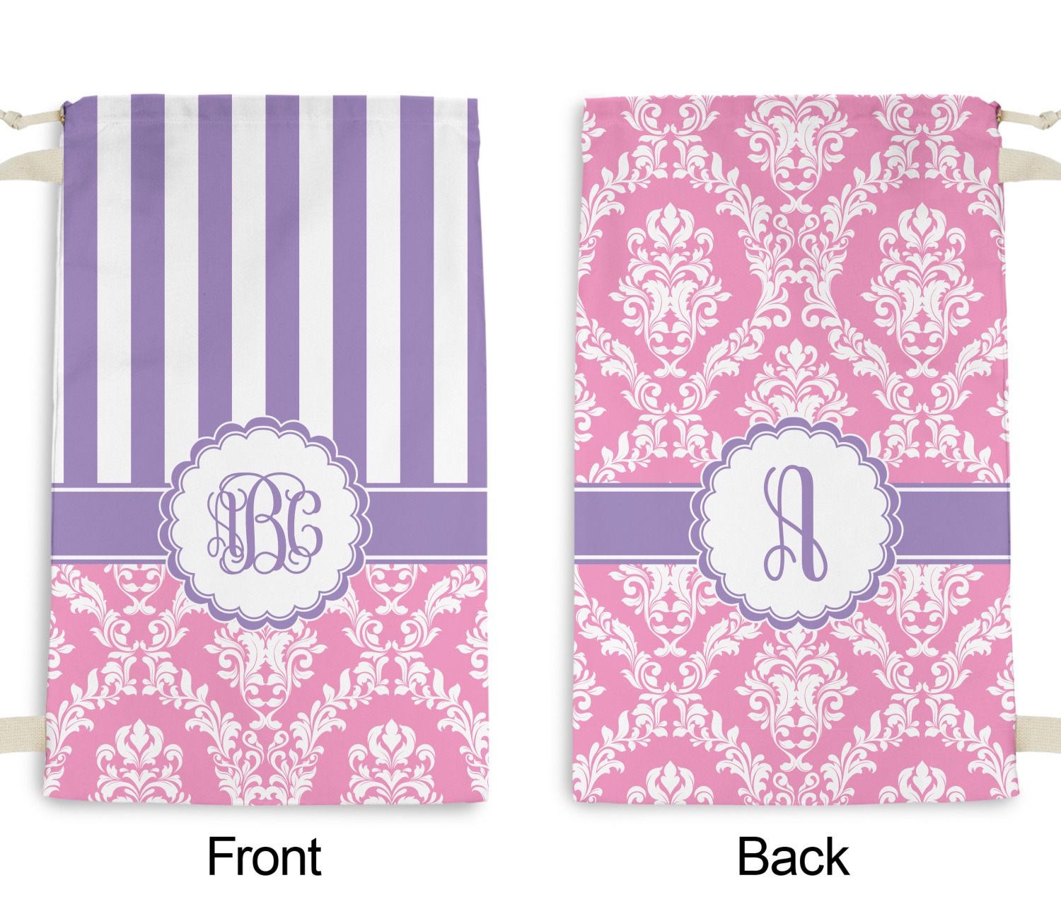 This stunning design is very feminine and elegant. It has simple, yet classic purple and white stripes on top with the stunningly elegant damask in pink and white on the bottom. The design is trimmed with a classic purple ribbon, along with a scalloped label and ever so beautiful interlocking monogram.