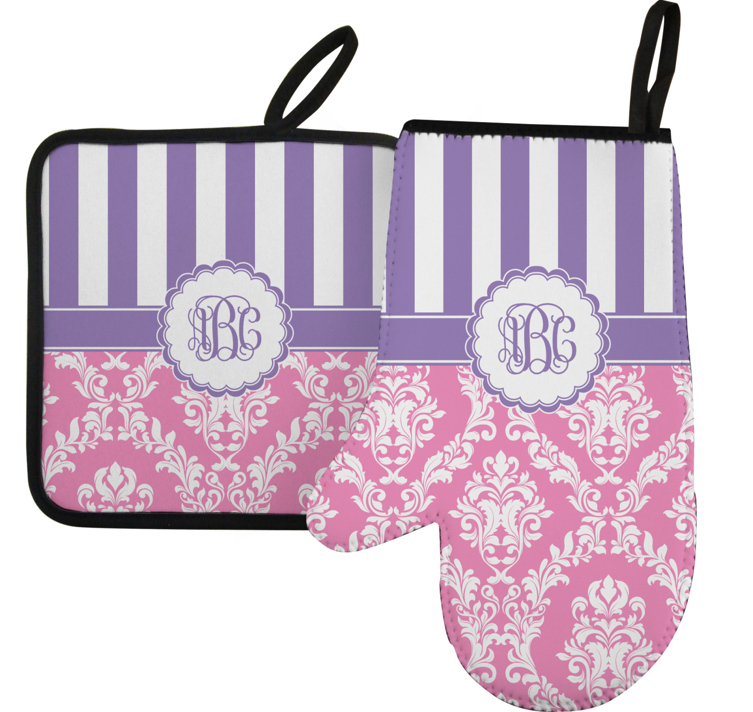 This stunning design is very feminine and elegant. It has simple, yet classic purple and white stripes on top with the stunningly elegant damask in pink and white on the bottom. The design is trimmed with a classic purple ribbon, along with a scalloped label and ever so beautiful interlocking monogram.