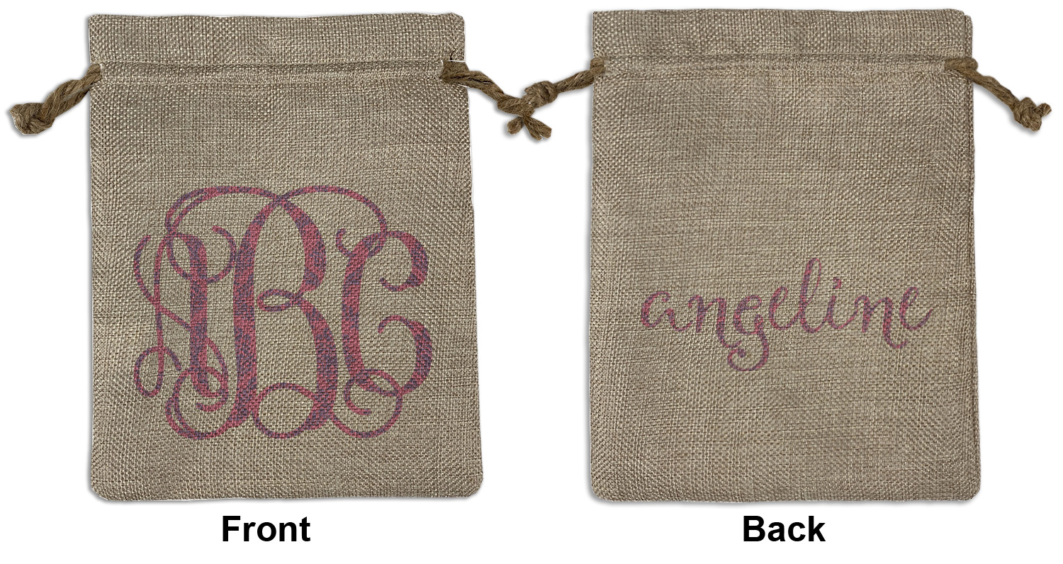We sell our Burlap Gift Bags in 3 variant sized bags. Made with burlap polyester, each personalized bag can be secured with a twine drawstring pull. Your custom design is available to print on one side or both sides - completely up to you! The sizes of the bags measure approximately 4.5" x 6.5" for the smallest size, 6.5" x 8.0" for the medium size, and 6.5" x 13.5" for the large-sized bag.