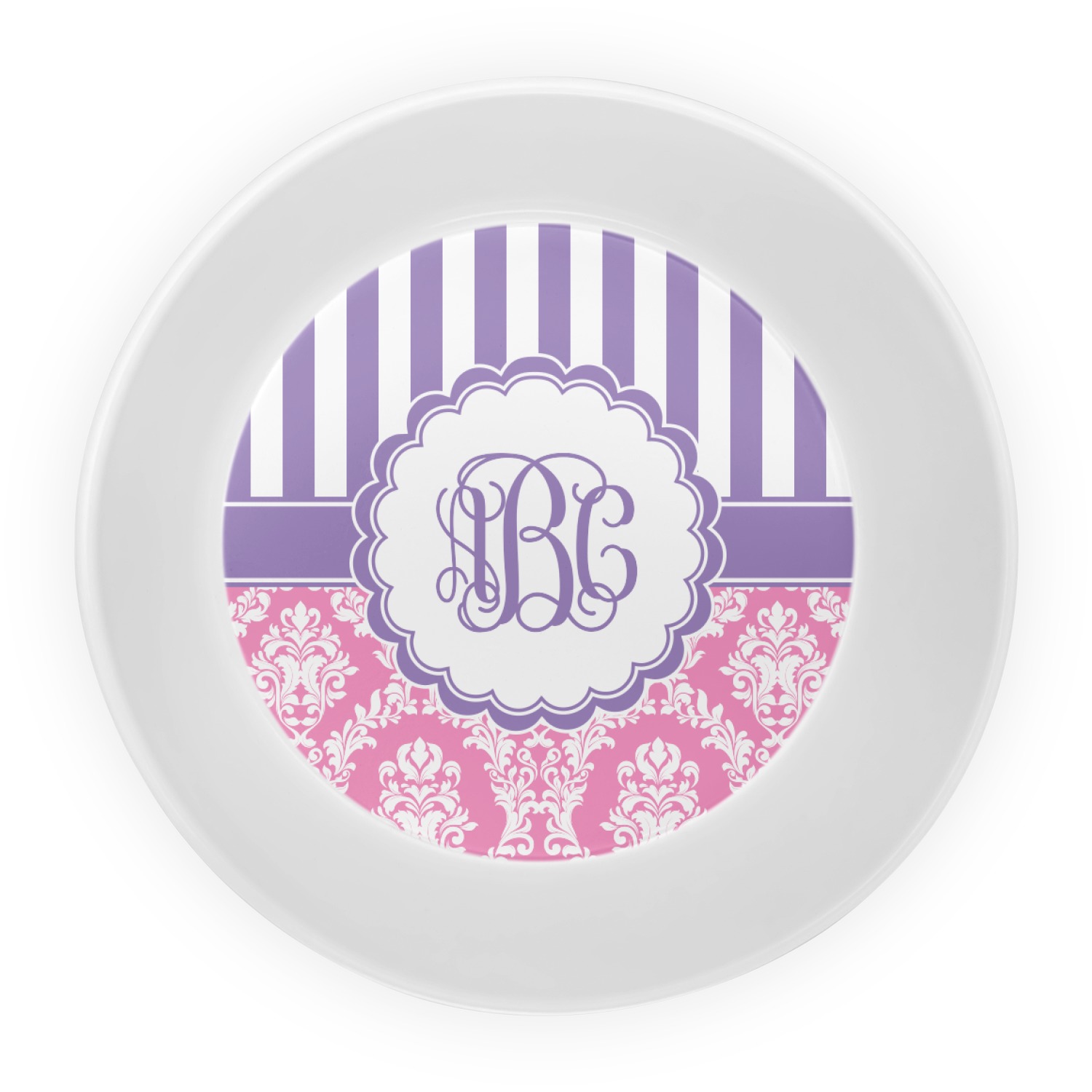 This stunning design is very feminine and elegant. It has simple, yet classic purple and white stripes on top with the stunningly elegant damask in pink and white on the bottom. The design is trimmed with a classic purple ribbon, along with a scalloped label and ever so beautiful interlocking monogram.