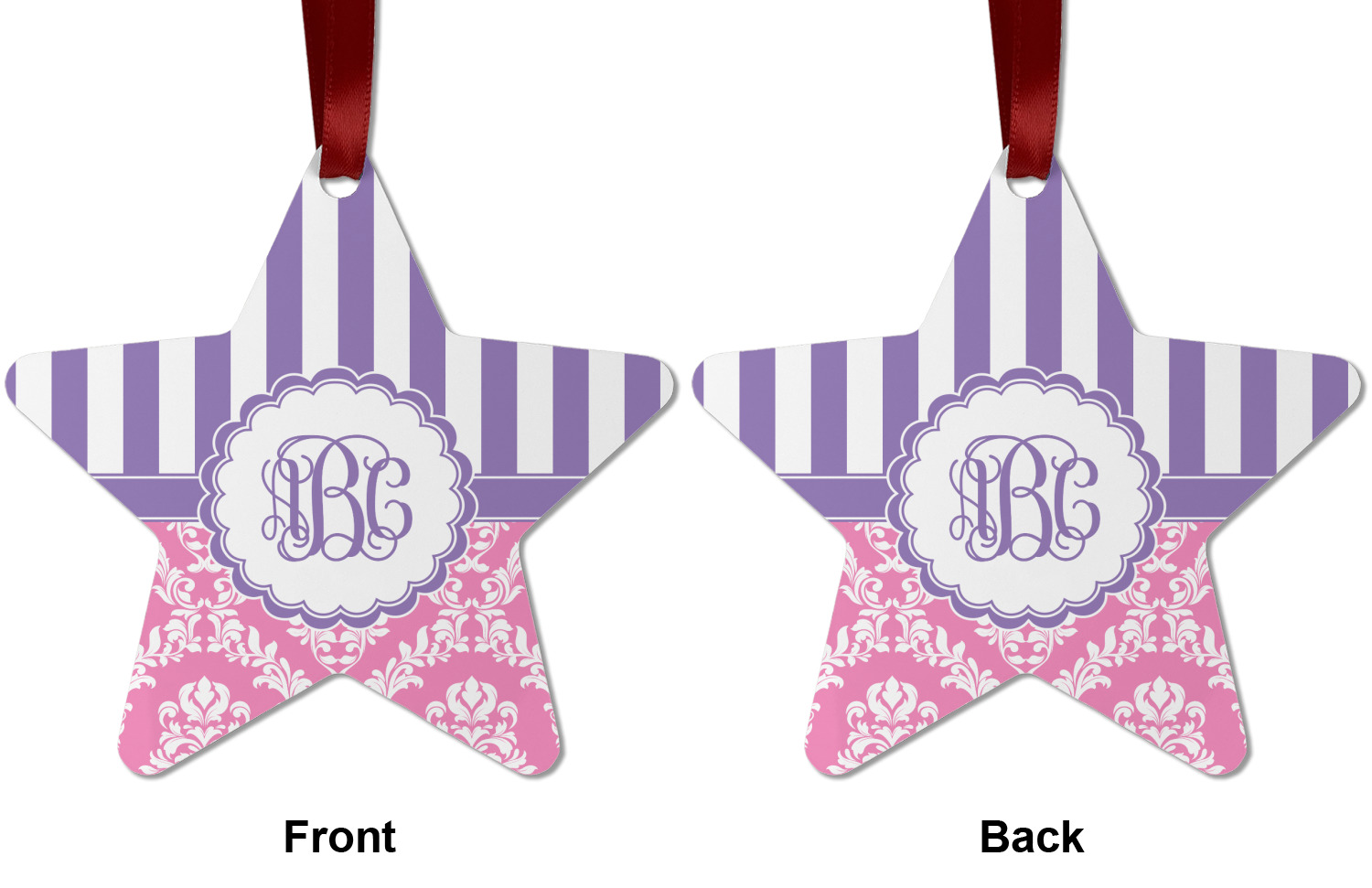 This stunning design is very feminine and elegant. It has simple, yet classic purple and white stripes on top with the stunningly elegant damask in pink and white on the bottom. The design is trimmed with a classic purple ribbon, along with a scalloped label and ever so beautiful interlocking monogram.