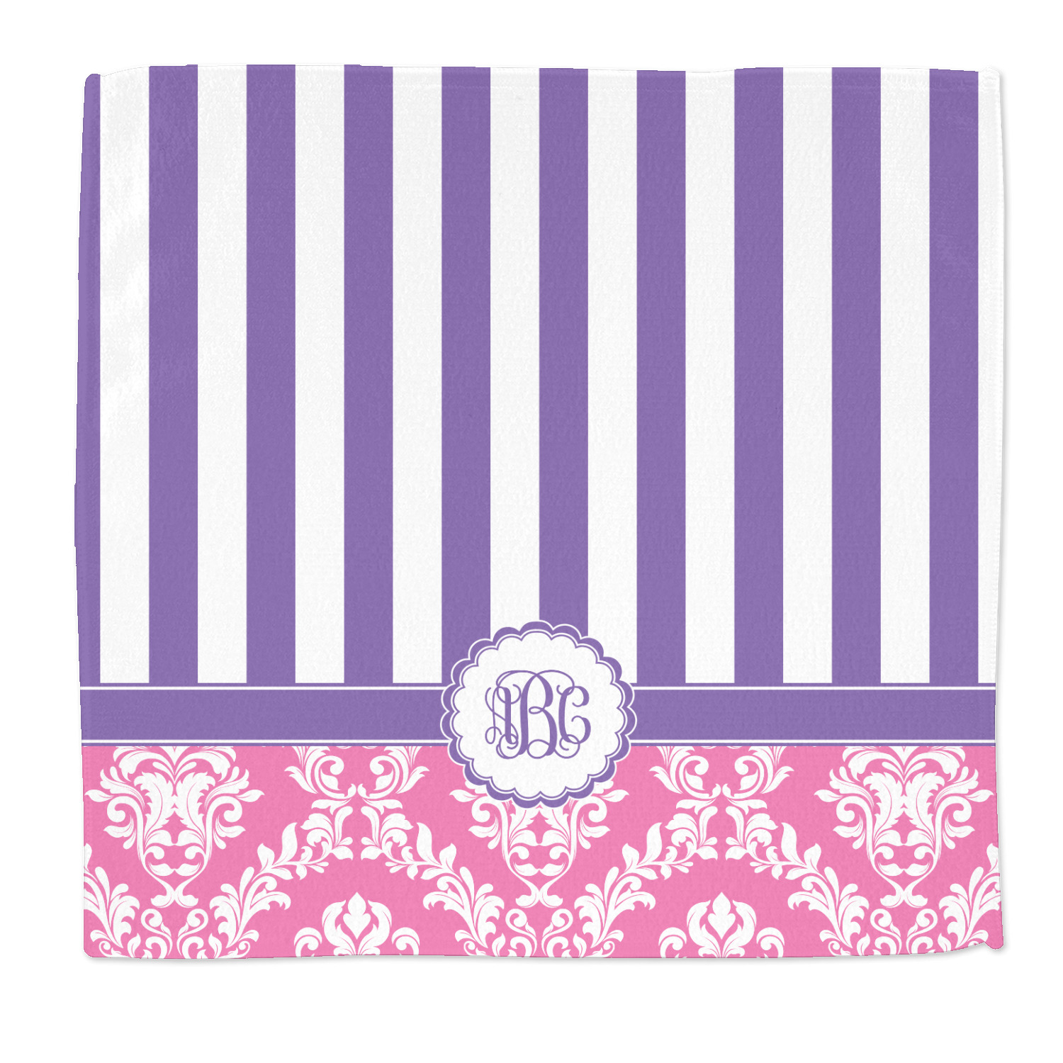This stunning design is very feminine and elegant. It has simple, yet classic purple and white stripes on top with the stunningly elegant damask in pink and white on the bottom. The design is trimmed with a classic purple ribbon, along with a scalloped label and ever so beautiful interlocking monogram.