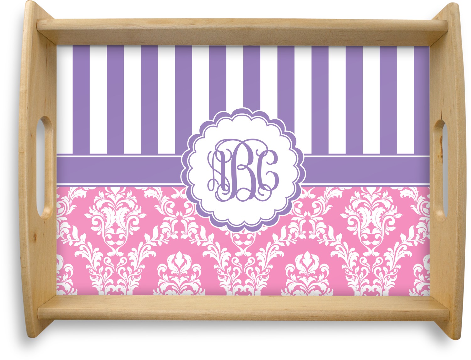 This stunning design is very feminine and elegant. It has simple, yet classic purple and white stripes on top with the stunningly elegant damask in pink and white on the bottom. The design is trimmed with a classic purple ribbon, along with a scalloped label and ever so beautiful interlocking monogram.