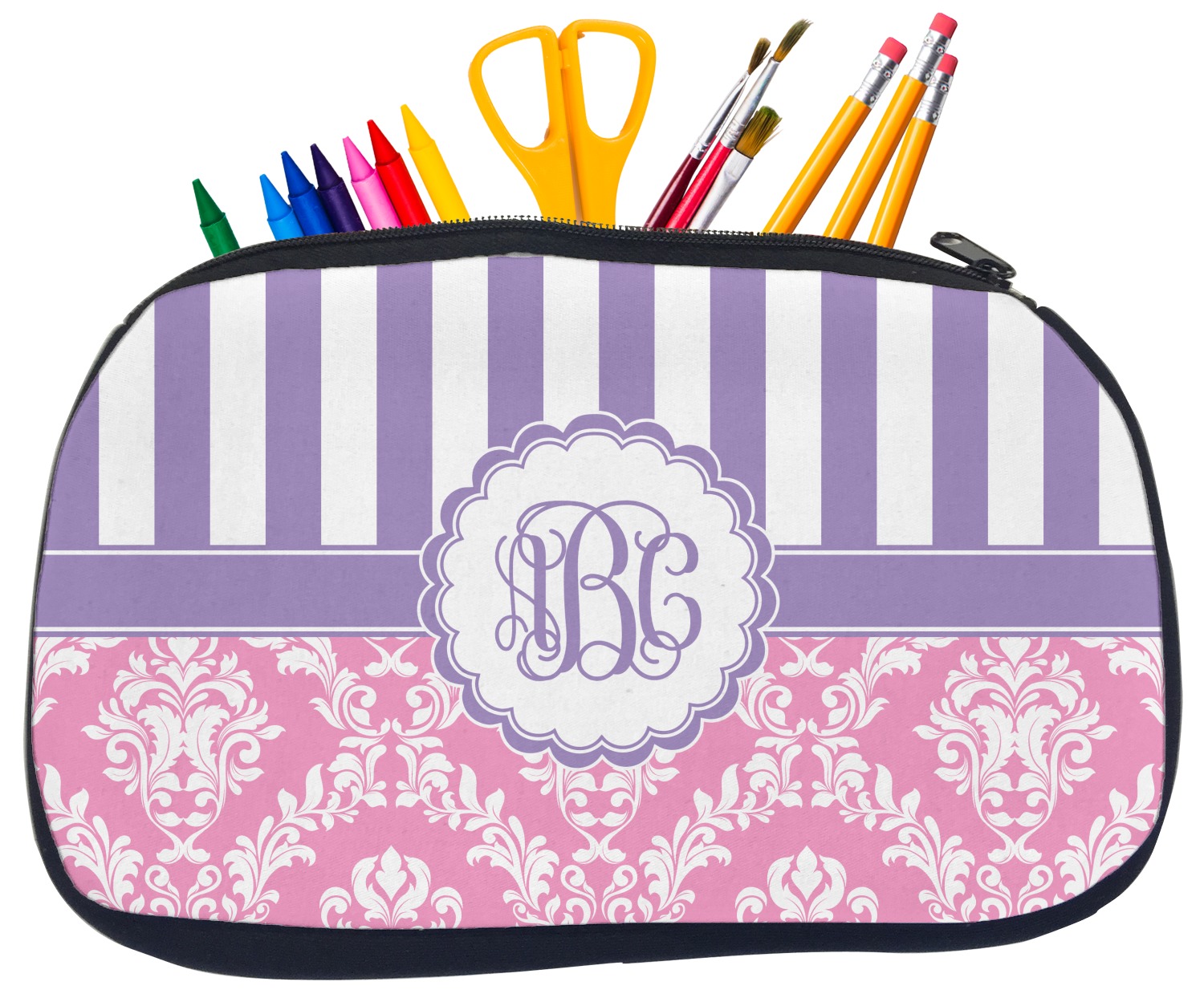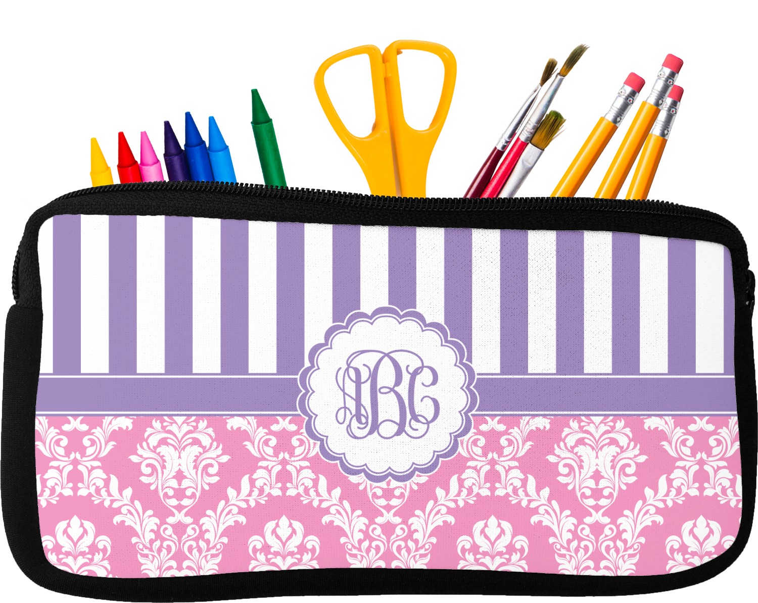 Built from durable neoprene, these pencil pouches, are water resistant, and prevent leaking ink from spilling into your backpack or purse. These custom pencil cases secure with a robust, black zipper. We print your personalized design on the front of this pouch, while the remaining sides a simple black color. These colored pencil cases [880] are sold in two sizes; our smaller version measures at 8.5 by 4.5 inches, while the medium measures at 10.5 by 6.5 inches. The smaller size is more suitable for holding pencils and pens, while our medium size can accommodate pencil sharpeners, scissors, and erasers.