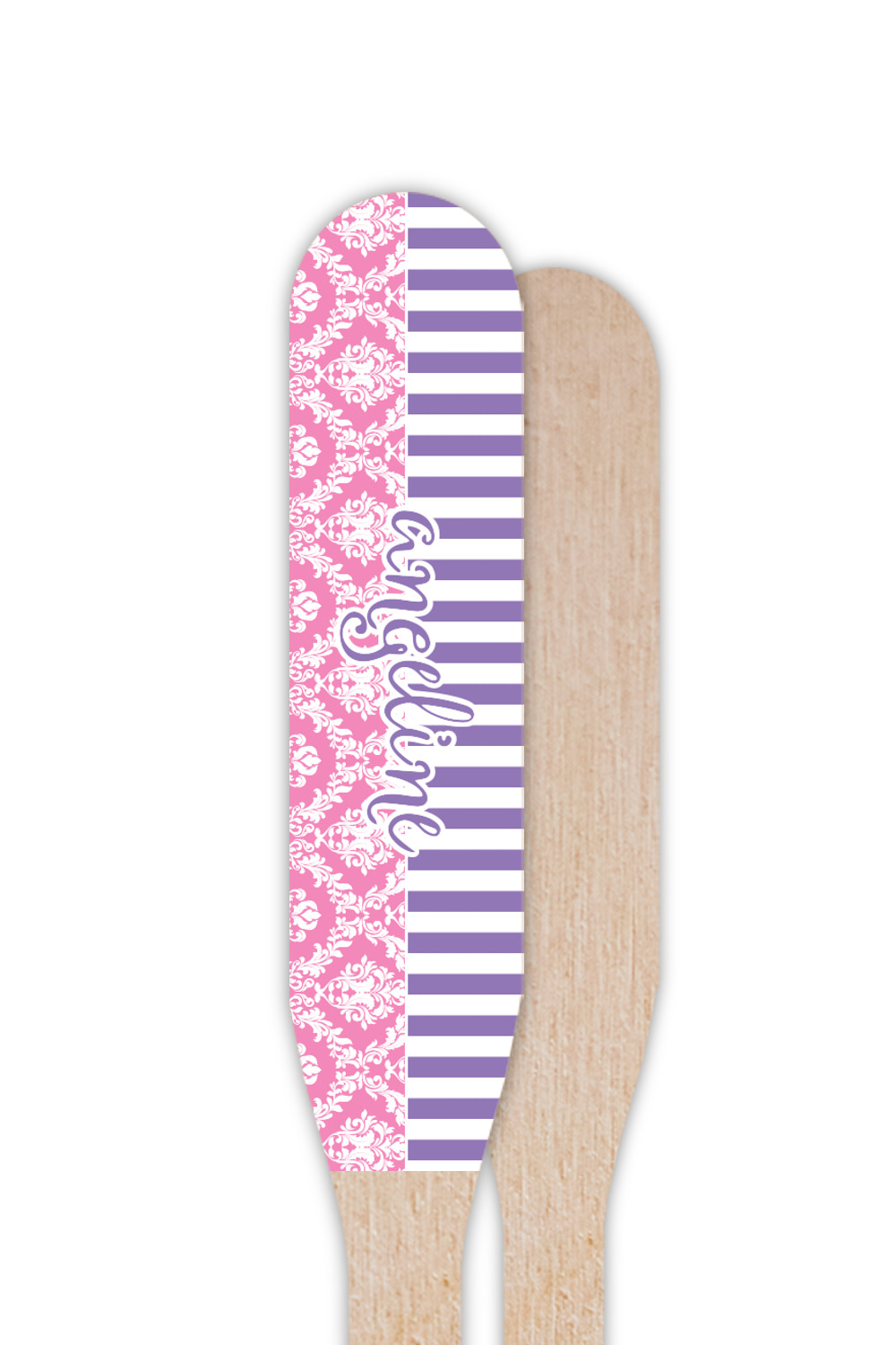 This stunning design is very feminine and elegant. It has simple, yet classic purple and white stripes on top with the stunningly elegant damask in pink and white on the bottom. The design is trimmed with a classic purple ribbon, along with a scalloped label and ever so beautiful interlocking monogram.