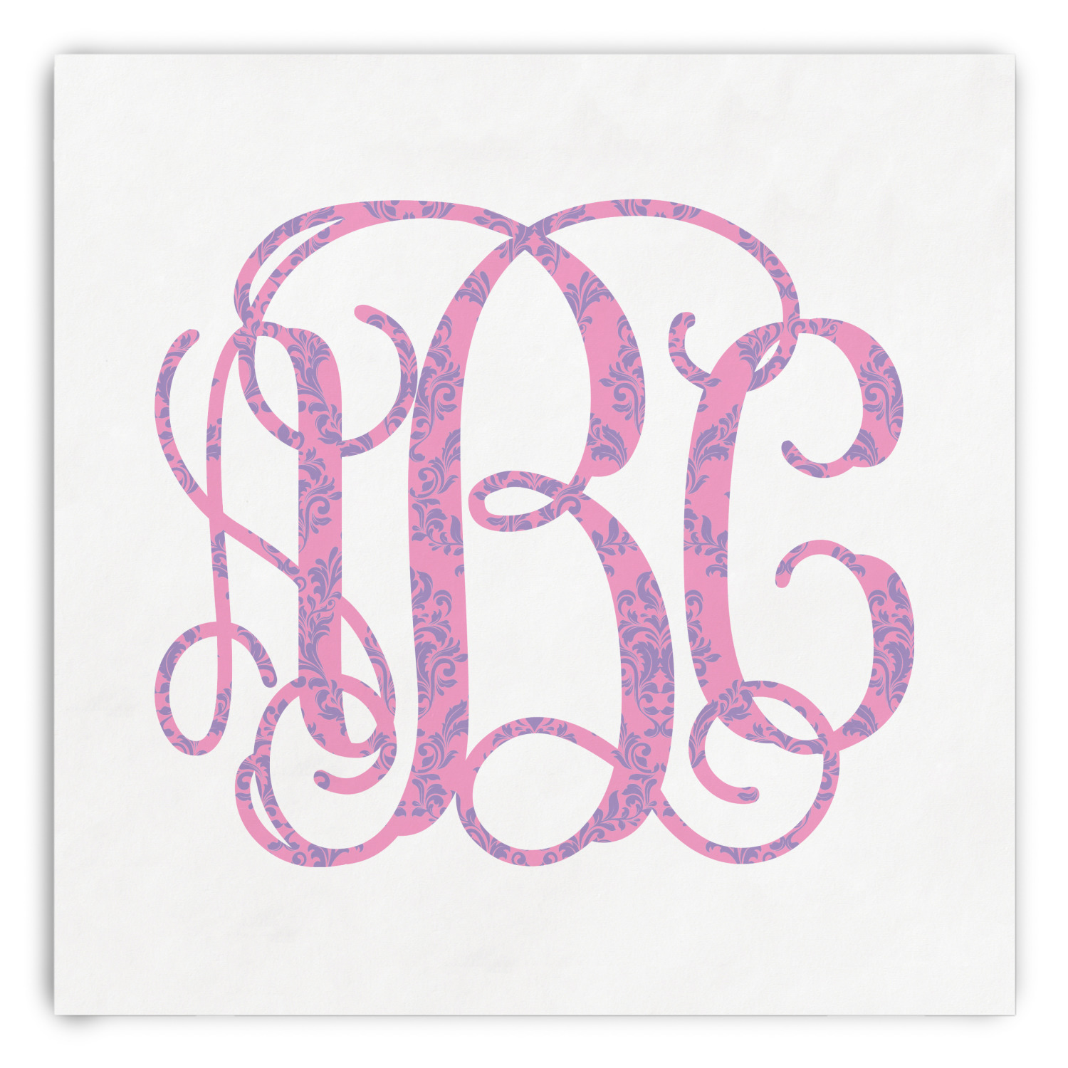 This stunning design is very feminine and elegant. It has simple, yet classic purple and white stripes on top with the stunningly elegant damask in pink and white on the bottom. The design is trimmed with a classic purple ribbon, along with a scalloped label and ever so beautiful interlocking monogram.