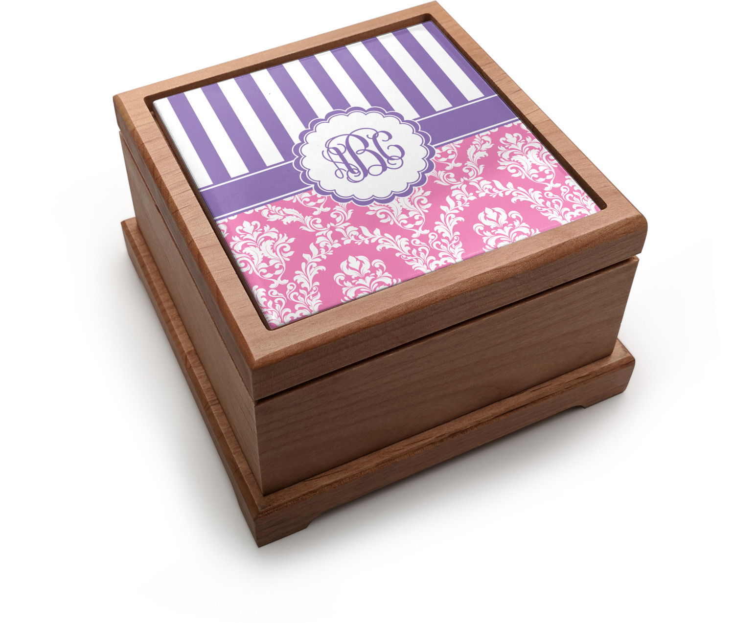 This stunning design is very feminine and elegant. It has simple, yet classic purple and white stripes on top with the stunningly elegant damask in pink and white on the bottom. The design is trimmed with a classic purple ribbon, along with a scalloped label and ever so beautiful interlocking monogram.